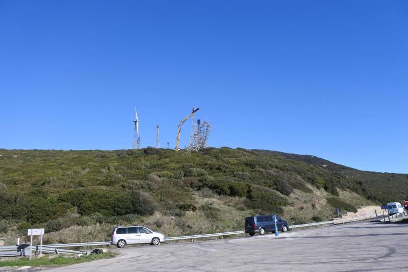 Vanmorgen is de lucht helder en schijnt de zon uitbundig. Dat komt goed uit want op weg naar Tarifa passeren we een uitkijkpunt de Mirador del Estrecho. Vanaf hier kun je een korte wandeling maken naar een punt vanwaar je zowel de Jebel Musa als de rots van Gibraltar kunt zien. Deze twee worden volgens de Griekse Mythologie ook wel de Zuilen van Hercules genoemd. Nadat we de camper bij het uitkijkpunt parkeren hebben we inderdaad een prachtig uitzicht op de straat van Gibraltar en zien we de Jebel Musa aan de overkant in Marokko liggen. De rots van Gibraltar kun je vanaf het uitkijkpunt niet zien omdat deze achter een heuveltop schuil gaat. Dus willen we met de wandeling aanvangen om naar een gunstiger gelegen positie te gaan. Dat blijkt helaas niet mogelijk. Het gebied waar het pad ligt is kennelijk privé-terrein en tegenwoordig afgesloten met een hek. Als pleister op de wonde zien we dat juist op het moment dat wij bij het uitkijkpunt zijn een nabijgelegen windmolen wordt afgebroken. Als een heuse Don Quichot gaat een grote kraan de molen te lijf, waarbij het ditmaal de molen is die het onderspit moet delven. Na het korte bezoek aan de mirador rijden we door naar camping Valdevaqueros.