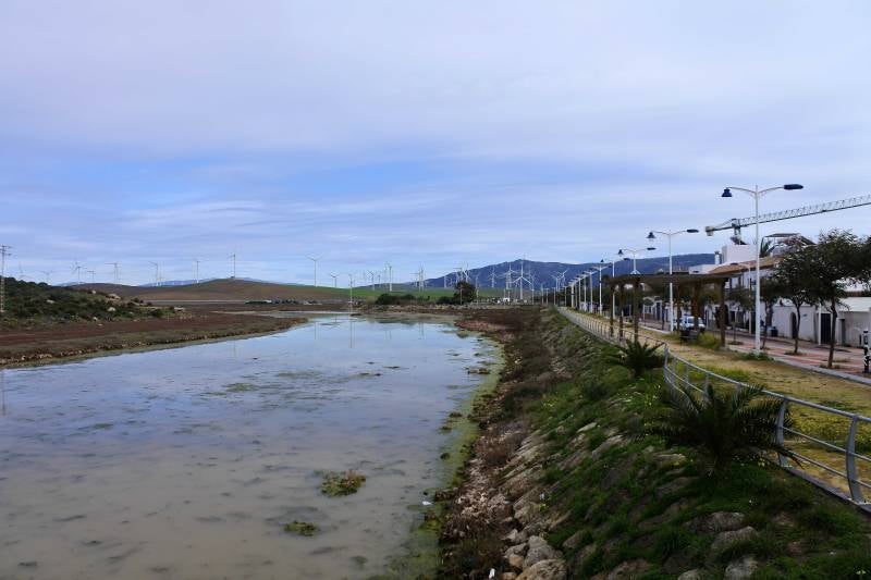 Na een dag binnen zitten vanwege de regen willen we vandaag er op uit om een frisse neus te halen. Hiervoor is een duin- en strandwandeling uitgekozen in het gebied van Los Lances, dat halverwege de camping en de stad Tarifa ligt. Vanmorgen vroeg is de lucht strak blauw, maar tegen de tijd dat wij op stoom zijn verschijnen er toch al weer wolken die er soms ook vervaarlijk uitzien. We zien het wel en pakken de fiets om naar het beginpunt van de wandeling te gaan, wat vijf kilometers langs een vrij drukke provinciale weg rijden inhoudt. Gelukkig is er een soort vluchtstrook aanwezig, zodat de auto’s niet al te dicht langs ons razen. De fietsen worden geparkeerd bij het strand ter hoogte van een school voor kite-surfers en we kijken eerst even naar hun vorderingen voordat we op pad gaan. Het eerste stuk gaat door een duingebied met lage, breed uitwaaierende bomen. Dan is er de monding van een rivier waar de route aan de strandzijde er omheen gaat. Nu wij er zijn blijkt er flink wat water aanwezig en gaat het niet lukken om er met droge voeten overheen te gaan.