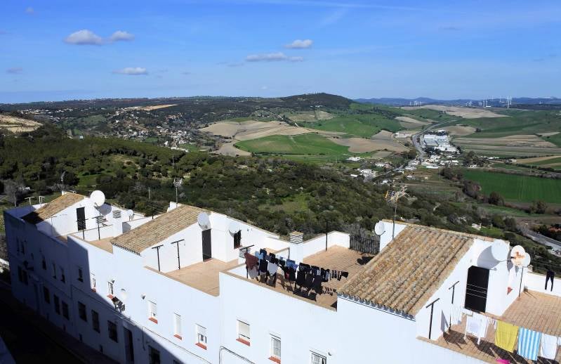 Vejer, of voluit Vejer de la Frontera, ligt op ongeveer twee kilometer van onze camping. Het ligt op een 200 meter hoge heuvelrug, terwijl onze camping op ruim vijftig meter hoogte is gelegen. Er tussen stroomt de rivier de Barbate en die bevindt zich nagenoeg op zeeniveau. Dit betekent dat we voor een bezoek aan Vejer eerst omlaag moeten en daarna weer steil omhoog. Er rijdt geen bus, dus pakken we voor het eerste stukje de fiets en roetsjen omlaag tot in het gehucht Barca de Vejer. Vandaar gaan we te voet het steile weggetje op dat ons tweehonderd meter hoger in het centrum van Vejer brengt, een pittig klimmetje mag je wel zeggen. Het ommuurde middeleeuwse centrum van het stadje is goed bewaard gebleven en daarmee een toeristische trekpleister. Wij maken eerst een rondwandeling door het centrum en houden aansluitend een koffiepauze op het mooie en gezellige Plaza d’Espaňa.