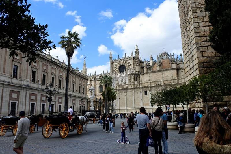 Vanaf het Plaza de Espaňa lopen we door het Parque de Marie Luisa en vandaar langs de rivier terug naar het centrum. Hierna gaan we naar de kathedraal waar we ons aansluiten bij de rij wachtenden. Een half uurtje later zijn we binnen en komen in de immense kerk, waar we behalve de vele kapellen ook het grootste altaarkunstwerk ter wereld en de tombe van Columbus kunnen bekijken. Op de plaats van de kerk stond vroeger een moskee en de toren naast de kerk, de Giralda, was vroeger een minaret. We beklimmen de toren voor een mooi uitzicht over het centrum van Sevilla. Opvallend is de afwezigheid van traptreden. In plaats hiervan moeten we steeds tegen een hellende vloer oplopen, waarover men vroeger per paard naar boven kon. Weer buiten zien we een enorme wachtrij voor het Real Alcazar, het paleiskasteel. We besluiten dit onderdeel naar morgen te verschuiven en besluiten onze wandeling van vandaag met een tocht door de vroegere Joodse wijk.