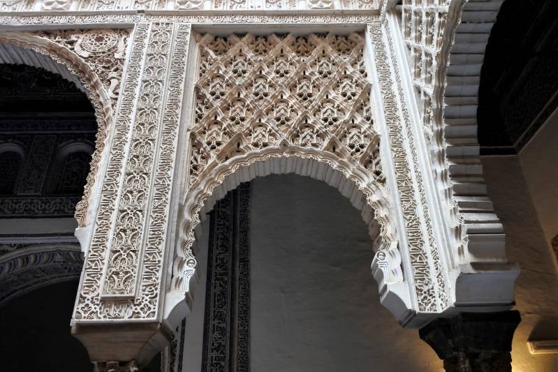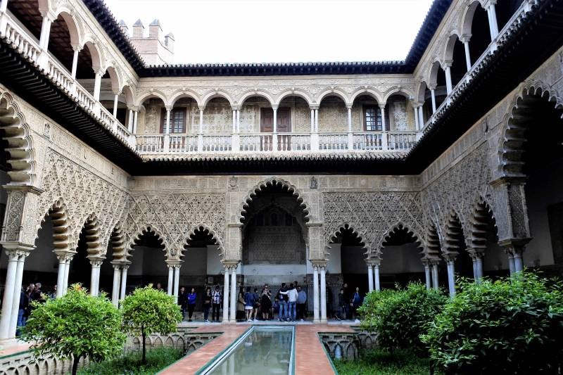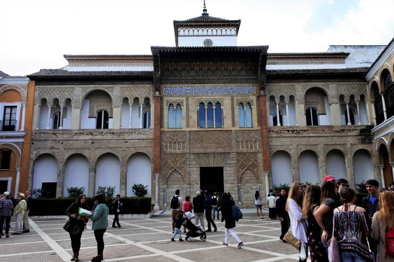 Het paleiskasteel is anders dan de meeste andere kastelen omdat het niet op een heuvel staat. In de hele omgeving zijn immers geen bergen. Daarnaast is het geen echt Moors bouwwerk, maar door de Spaanse koning Pedro gerealiseerd in een tijd in Granada de Moren nog in het zadel zaten. De stijl is dan ook een mengvorm, de Mudejar stijl met zowel Moorse als Christelijke elementen die gids Sergio ons haarfijn weet aan te geven. Net als in het Moorse paleis in het Alhambra van Granada, zijn ook hier de mooiste versieringen aangebracht om de toenmalige bezoekers van de koning te imponeren. Bij het stadspaleis hoort ook een riante tuin. Deze vinden we nog fraaier dan die van het Alhambra.