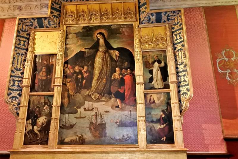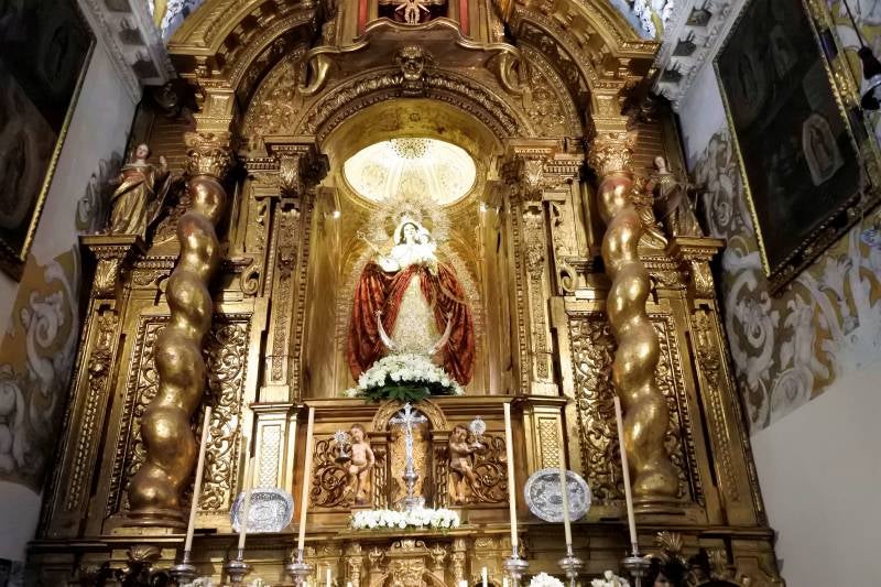 Na het bezoek aan het Real Alcazar lopen we eerst nog even terug naar de oude Joodse wijk waar we gisteren de Iglesia Santa Maria la Blanca gesloten troffen. De kerk uit de veertiende eeuw was eerst een moskee en daarna een synagoge. Van buiten niets bijzonders, maar binnenin een prachtig interieur met barokversieringen waarbij je je ogen uitkijkt.