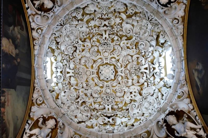 Iglesia Santa Maria la Blanca in de oude Joodse wijk, overal gedetailleerde versieringen in barok stijl.