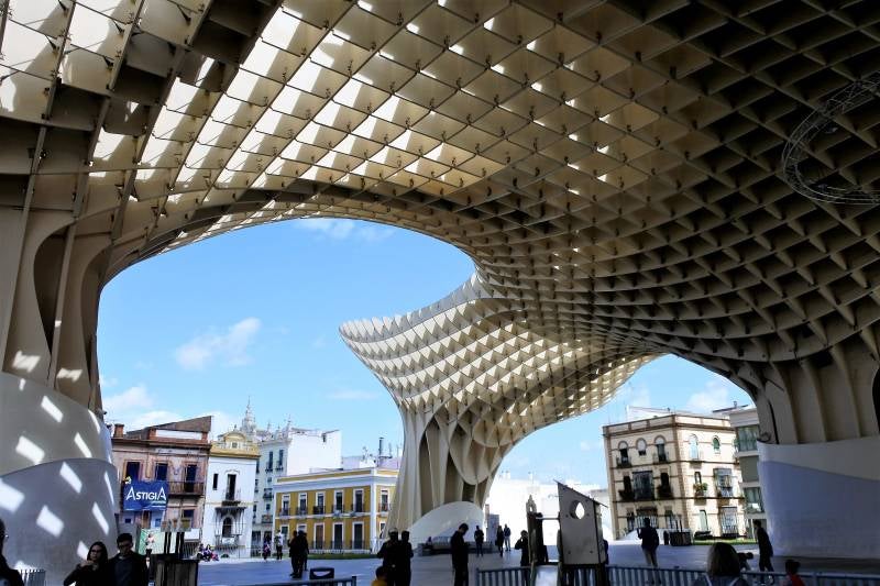 Na het kerkbezoek vervolgen we onze wandeling en lopen via het Plaza Nueva met het stadhuis naar de Metropol Parasol. Op het Plaza Mayor is een groot complex neergezet van drie verdiepingen. In het ondergrondse deel zie je een verzameling archeologische vondsten. De begane grond herbergt een overdekte markt (inclusief penetrante vislucht) en daar bovenop is een grote houten constructie geplaatst, waarvan de vorm aan paddenstoelen zouden doen denken. We gaan met de lift omhoog en komen zo bovenop de houten constructie. Hier kun je een rondwandeling maken, waarbij je vanaf ruim twintig meter hoogte een prachtig uitzicht over de stad hebt. Wij maken onze rondwandeling verder af via de Plaza de Toros (de stierenvechters arena) en de wijk Triana waar de flamenco dans zijn oorsprong vond.