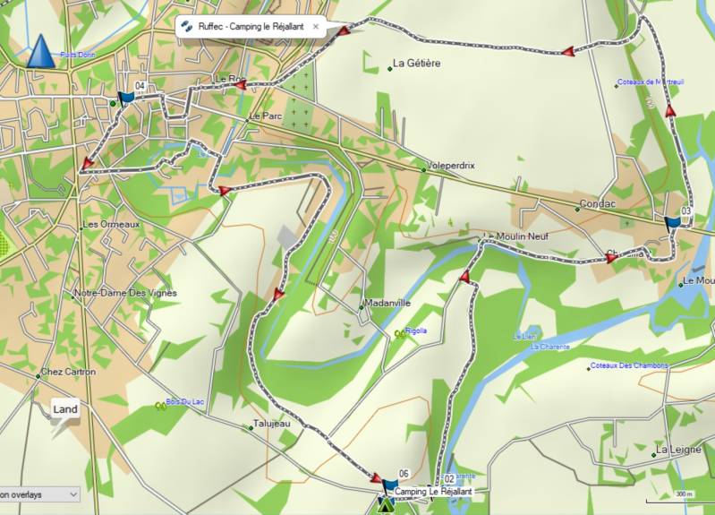 Na een paar dagen rijden houden we vandaag een dagje rust. Lekker uitslapen dus, maar toch geen reden om de rest van de dag op onze krent te blijven zitten. Vandaar dat we een wandelingetje in de omgeving gaan maken om zo het gebied waar we nu zijn te verkennen. De camping ligt officieel bij het gehucht Condac, maar op gelijke afstand bevindt zich het stadje Ruffec. Er is geen pasklare wandeling voorhanden, dus maak ik er zelf maar een met behulp van ons eigen kaartmateriaal en dat blijkt goed uit te pakken. Eerst lopen we naar het riviertje de Charente en daarna komen we in Condac dat eveneens aan het riviertje ligt. Condac is een van de vele Franse gehuchtjes waar de tijd stil lijkt te hebben gestaan. Vandaar gaat de route eerst verder langs de rivier en vervolgens door golvend akkerland totdat we in Ruffec komen.
