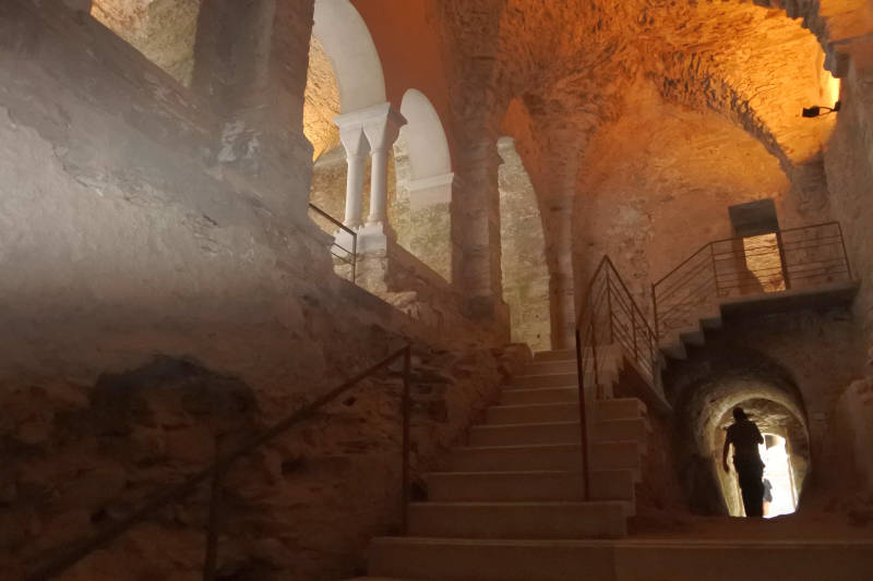 Afgelopen nacht hadden we het rijk alleen. Boven op een berg en niemand in de buurt met licht en geluid. Doordat het momenteel nieuwe maan is, resten buiten alleen het licht van de sterren en de lichtjes onder ons in het dal. Bovendien is het windstil en zakte de buitentemperatuur maar tot een graad of zestien. Een camperplek++ zou je deze kunnen kwalificeren. Wat verderop zien we een ruïne van een kasteel nog eens twee honderd meter hoger dan wij. En naar die ruïne willen we vandaag naar toe. Maar eerst nog even over ons kloosterbezoek van gistermiddag.