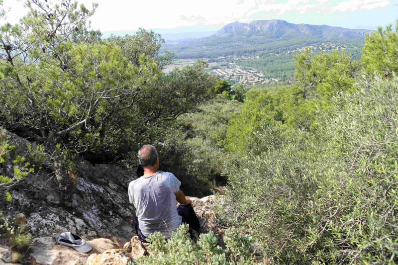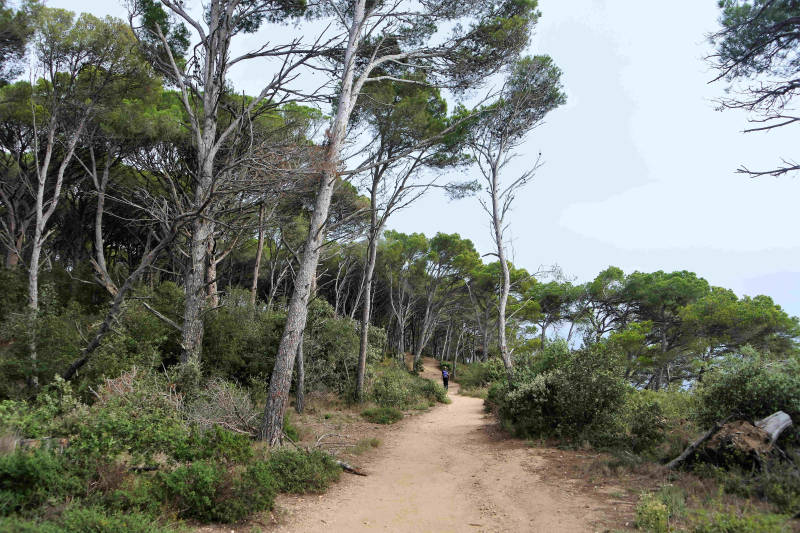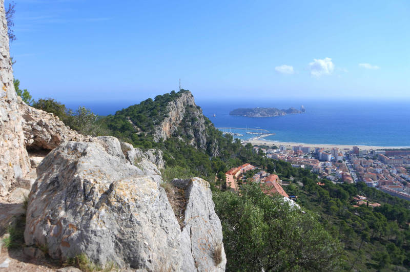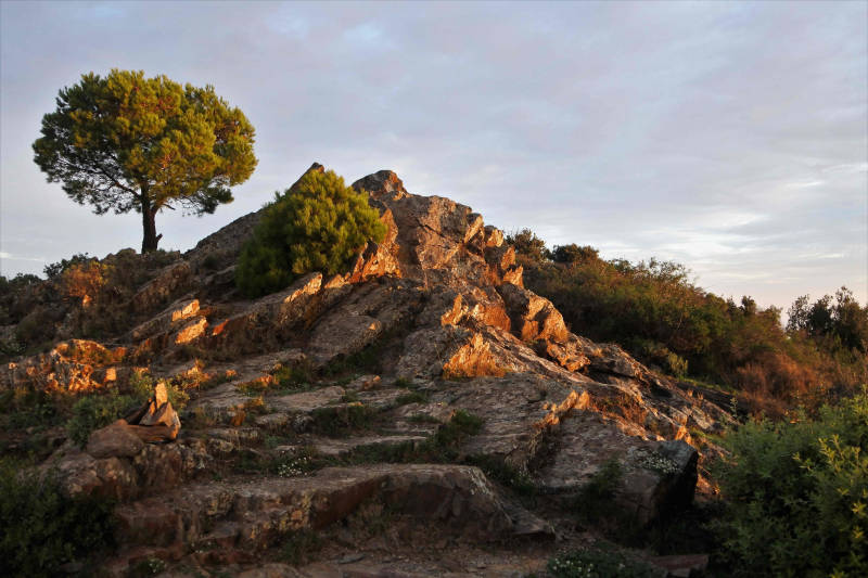 Ten noorden van L’Estartit ligt het natuurgebied de Montgri. Tussen de Montgri en de vlakte ten zuiden ervan, is een steile heuvelrug van ruim 200 meter hoogte aanwezig. De heuvelrug is samengesteld uit drie delen: De Tossal Gros, de Torro Maratxa en de Roca Maura. Wij gaan deze ‘reuzen in zakformaat’ vandaag beklimmen. Na een stuk van ongeveer anderhalve kilometer over een vlakke weg moeten we direct vrij steil omhoog. Het is even zoeken naar de juiste paden want die gaan hier kriskras alle kanten uit. Na een kwartiertje klimmen komen we aan de voet van een steile rotswand. Gelukkig gaat het pad met een bocht schuin omhoog zodat de klim die nu volgt niet al te moeilijk, is maar wel de nodige zweetdruppels kost. Anders dan het weerbericht vooraf aangaf is het vandaag weer stralend weer en zijn we blij dat we de bescherming van bomen hebben en zo nu en dan de afkoeling van een briesje. Uitrustend boven op het begin van de rotswand en genietend van een prachtig uitzicht, vragen we ons af hoeveel mensen hier in vroeger tijden al hebben gezeten. En die vraag wordt later via internet beantwoord, als we lezen dat hier een grot is met daarin overblijfselen uit de prehistorie. Wij vervolgen onze wandeling over de kam en komen zo bij een nieuw letterlijk hoogtepunt, de Torro Maratxa. Ook nu weer mooie vergezichten, maar ook opvallend is het stenen bouwwerk op de rotspunt. Het blijkt het huisje van een schildwacht en dateert uit de late middeleeuwen. Het materiaal ervoor zou afkomstig zijn van een kasteel dat hier in de buurt heeft gestaan. We trekken weer verder, ditmaal naar de Roca Maura waar op de punt een zendstation is gebouwd. Via een omweg lopen we een stuk lager langs de heuvelrug weer terug totdat we uiteindelijk weer op de camping arriveren.
