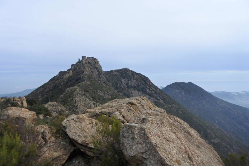 Vandaag, zoals gezegd, naar de ruïne van Castell Sant Salvador de Verdera. Dit kasteel ligt op een rots die boven Monistir Sant Pere de Rodes uittorent. Er zijn twee routes er naar toe. De kortste gaat zigzaggend steil omhoog met een hellingspercentage van 24 procent. De andere is langer en minder steil. Wij kiezen voor deze laatste, vooral ook omdat deze route ook nog langs Ermita Santa Helena de Rodes gaat. De stichting van deze, inmiddels in onbruik geraakte kapel, gaat eveneens terug tot de tiende eeuw. De kapel was het middelpunt van een dorpje dat floreerde in de tijd van de pelgrimages naar het klooster van Sant Pere de Rodes. Wij laten de kapel achter ons en gaan verder op weg naar de ruïne van het kasteel. Het eerste stuk loopt inderdaad niet al te lastig maar eenmaal over de helft van de afstand wordt het toch pittig. Onze GPS geeft aan dat we een, naar later blijkt verkeerd, pad op moeten waarbij we al snel genoodzaakt zijn om op handen en voeten te klauteren totdat het pad bovenop de rots plots ophoudt. Weer terug van deze dwaling vinden we het goede pad, maar ook nu moeten we alle zeilen bijzetten. Uiteindelijk bereiken we het kasteel en kunnen voldaan van het uitzicht genieten. Ook vandaag laat het weer ons daarbij niet in de steek. Weer terug bij de camper is het inmiddels al half vier en daarom besluiten we om nog een tweede nacht aan ons verblijf hier vast te knopen.