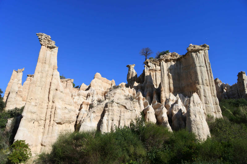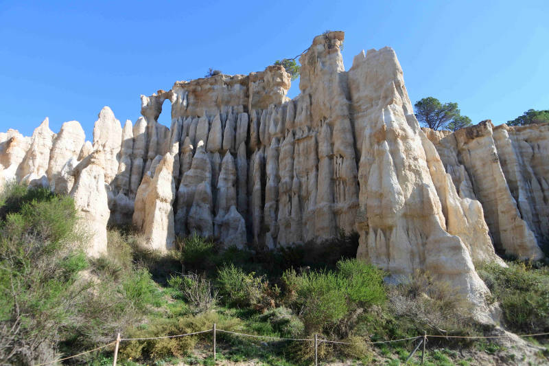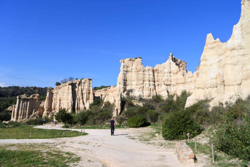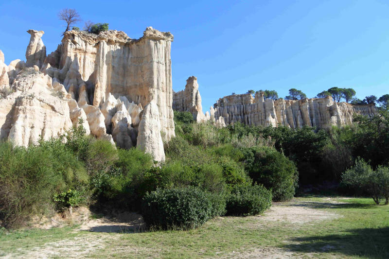Camping La Garenne in Néfiach blijkt, met uitzondering van wat verkeerslawaai, een prima overnachtingsplek en vlakbij Ill-sur-Tet. Vandaag dus een herkansing voor het bezoek aan Les Orgues, voordat we serieus de thuisreis aanvaarden. Het gebied waar we zijn is het stroomgebied van de rivier de Tet, die ontspringt in de Pyreneeën en bij Perpignan in de Middellandse zee uitkomt. In vroeger tijden heeft zich een dikke laag bestaande uit zand, klei, kalk en kiezel gevormd. Het is een meestal droog en onvruchtbaar gebied waar vroeger niet mee viel te beginnen. Maar vooral in de herfst kan het water met bakken uit de lucht komen en zorgen regen en de sterk gezwollen rivieren voor erosie van het zachte materiaal. Men spreekt dan van een l’Aiguat en dan kan er 150 tot 250 mm neerslag per dag vallen met records van 600 tot 800 mm. Oudere Calalanen herinneren zich oktober 1940 toen er in drie dagen tijd 1280 mm regen viel en de rivier de Tet 700 maal zijn normale hoeveelheid water afvoerde. In de loop van de tijd heeft de neerslag er voor gezorgd dat er grillige sculpturen zijn ontstaan, de ‘Orgues’, die bij nieuwe regenval (zoals onlangs nog) nog steeds van vorm veranderen.