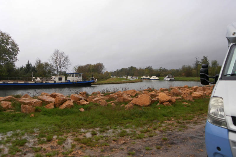 Vandaag een wat kortere rit die bovendien nog voor een deel over de tolweg gaat. Gisteravond en vannacht heeft het vrijwel voortdurend geregend maar bij het wakker worden is het droog. Het lukt nog net om buiten de eitjes te bakken, waarna de regen al weer inzet. Ook overdag moet er de hele tijd met de ruitenwissers aan worden gereden. Ons doel voor vandaag is de camperplaats van Pont-á-Bar, niet ver van de grens met België. Hier is een sluis in het Canal des Ardennes met er vlakbij een terrein dat voor opslagdoeleinden wordt gebruikt. Enkele jaren terug lagen hier oude woonschepen tegen de wal. Tegenwoordig schijnt het geen officiële camperplaats meer te zijn, maar wij storen ons daar nu even niet aan en hebben onze camper langs de oever neergezet. En we zijn niet alleen, want kort na ons arriveerde een collega camperaar die er kennelijk net zo over denkt.
