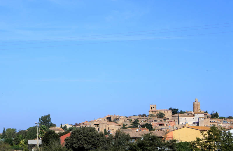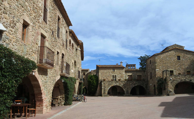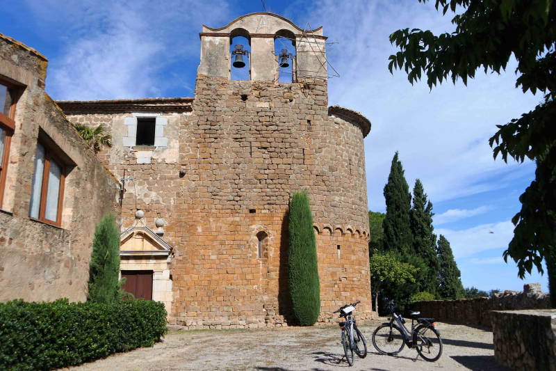 Het is ons gelukt om hier in de omgeving e-bikes te huren. En vanmorgen rond tien uur komt Pedro met zijn bestelwagen het campingterrein oprijden met twee Kross e-bikes voor ons. Anders dan de naam doet vermoeden betreft het hier ‘gewone’ fietsen zodat we deze e-bikes kunnen vergelijken met de mountain bikes die we vorige keer hebben gehuurd. De rit van vandaag gaat naar het zuiden, met het plaatsje Monells als hoofddoel. Hier in de omgeving zijn tientallen dorpjes die uit de middeleeuwen stammen en die heel goed geconserveerd zijn gebleven. Wij kunnen ze niet allemaal bezoeken en kiezen voor vandaag en de komen dagen de mooiste er uit. Met de fiets maken we een rondrit zodat we op één dag meerdere vliegen in één klap kunnen slaan. Of eigenlijk dorpjes zo u wilt. De rit gaat eerst naar het nabijgelegen Ultramort (geen beauty overigens) en vandaar via Sant Iscle d’Empordá, Matajudaica, Casavells en Corça naar Monells.