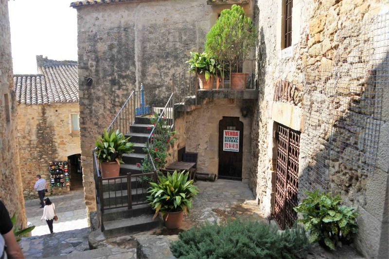 De camping ligt een stukje ten zuiden van het dorpje Pals. Dinsdags is het marktdag in Pals en dus een goede aanleiding om er vandaag naar toe te gaan. Ook vandaag is het weer warm en vooral Aukje heeft een hekel om over het asfalt van een drukke doorgaande weg te lopen. Daarom heeft ze met Google een alternatieve route uitgezocht, wel iets langer maar door het boerenland. We zijn nog maar juist op weg of we worden geconfronteerd met een fenomeen dat in Spanje vaker voorkomt: van openbaar pad veranderd in privé terrein en met een groot hek ervoor. Noodgedwongen lopen we nu maar langs de autoweg naar het dorp dat we in de verte al op een heuveltje zien liggen. Pals is al rond het jaar duizend ontstaan te midden van een moerasgebied en was jarenlang van strategisch belang. De moerassen zijn inmiddels omgetoverd in landbouwgrond waar vooral rijst op wordt verbouwd. De kern van Pals is maar klein, maar het middeleeuwse karakter is heel goed bewaard gebleven. Een trekpleister voor toeristen die met bussen worden aangevoerd. Na een bezoek aan de markt en nadat we alles binnen de dikke middeleeuwse muren hebben bekeken, zoeken we een terras op, waar we in de schaduw kunnen eten en drinken voordat we de thuisreis over het ook nu warme asfalt aanvaarden.