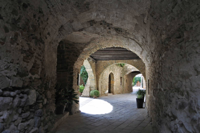 In Monells rijden we onder de boogpoort door zo de middeleeuwen in. Voor ons het sein om de fietsen te parkeren en te voet het dorpje te gaan bekijken. Na afloop schuiven we aan op het terras onder de arcade van de vestingmuur voor de lunch. Vanwege het gemak van de e-bikes durven we ons daarbij een cerveza te laten serveren. Weer op de zadels rijden we vervolgens met een boog weer naar huis en komen rond half vijf terug bij de camper.