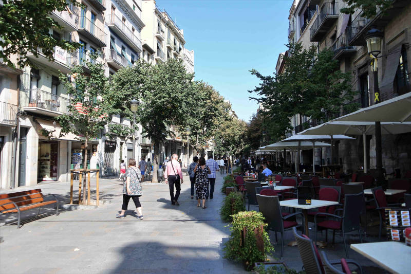 Wij willen vandaag eens met de bus op reis en hebben daarvoor het bezoek aan de provinciehoofdstad Gerona uitgekozen. Vooraf hebben we ons in de dienstregeling verdiept en daaruit blijkt dat een bus om half elf het nabijgelegen plaatsje Ultramort aandoet. Een beetje gehaast gaan we op weg naar de halte want we willen niet te laat komen. We krijgen immers geen tweede kans vandaag. Bij de bushalte treffen we een man van Marrokaanse komaf die in een huisje op de camping verblijft en in de omgeving op het land werkt om aan de kost te komen. Zijn vrouw woont nog in Marokko. We praten wat en wachten intussen op de bus die inmiddels al over tijd is. De man stelt ons gerust dat de bus vaak wat later is en inderdaad, twintig minuten later dan gepland kunnen we instappen. De reis van een kleine dertig kilometer duurt zo’n drie kwartier, maar vandaag toch nog wat langer. Halverwege in het stadje Flaça blijkt de spoorwegovergang gesloten. En niet voor even maar voor onbepaalde tijd zo het lijkt. Monteurs zijn druk bezig en steeds gaat een boom omhoog en weer omlaag maar de lichten blijven op rood. Na overleg met een achteropkomende bus besluit de chauffeur om te keren, wat geen sinecure is omdat het achteropkomende verkeer niet erg wil meewerken. Met nog een extra half uur vertraging rijden we uiteindelijk het moderne ondergrondse busstation van Gerona binnen. In de stationshal drinken we koffie voordat we ons richting het centrum begeven.