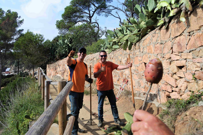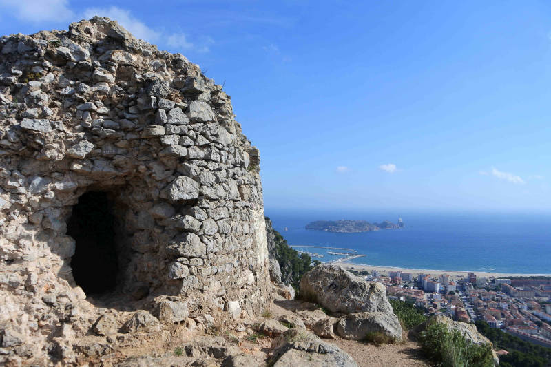 Als wij passeren is men net bezig de cactussen te snoeien. Dat levert ons nog een leuk onderonsje met de werklui op die Aukje een paar cactusvruchten oplevert. Volgens hen smaken ze naar kiwi, maar je moet de schil niet aanraken want die is giftig. We aanvaarden ze in dankbaarheid maar besluiten om ze toch maar niet te proeven. Verder lopend langs de Camino de Ronda, zoals ons wandelpad heet en gaan we langs een lang strand dat Platja de Castell is genoemd, naar de even verderop gelegen ruïne. Het is van de zesde eeuw voor Christus tot aan de Romeinse tijd een Iberisch kasteel geweest. De functie van de kastelen langs de kust was het tegengaan van invallen door piraten.