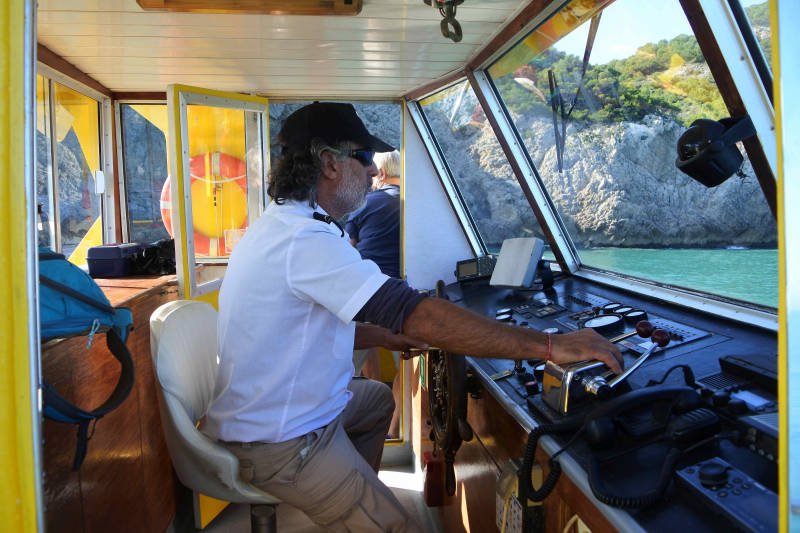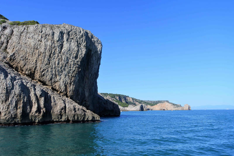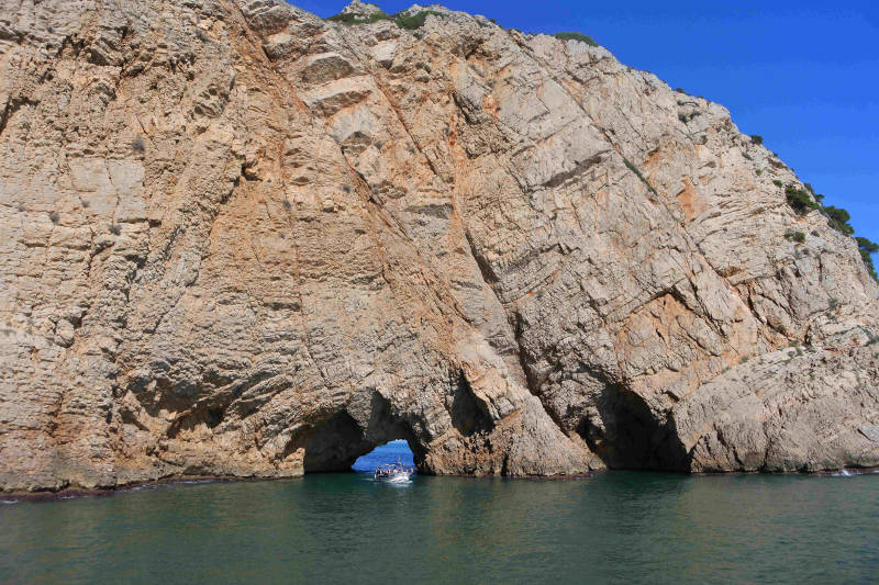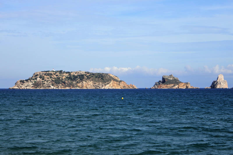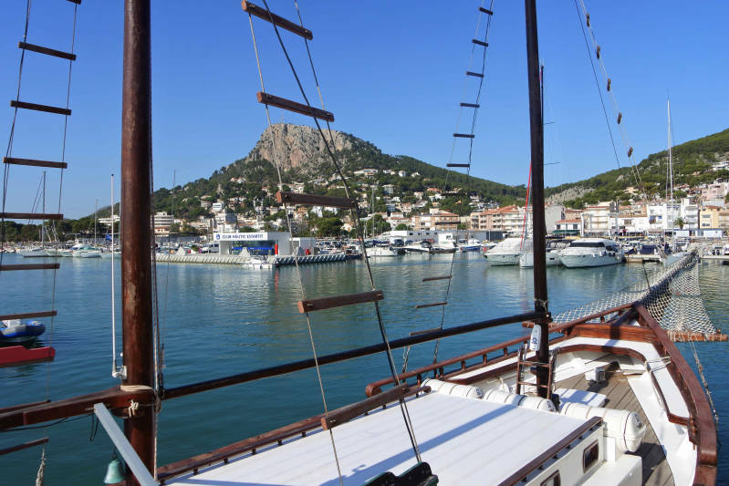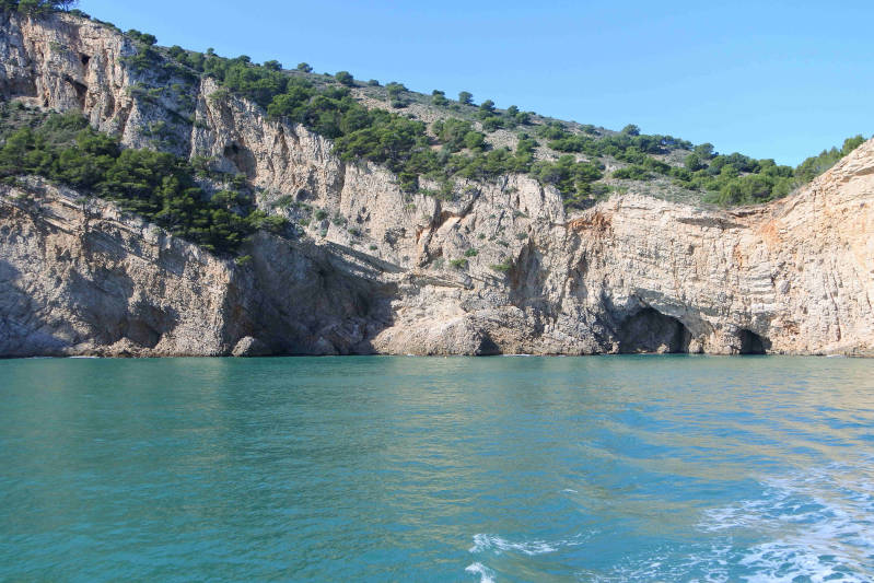 Vanuit de haven van Roses gaat er dit seizoen geen rondvaartboot meer de zee op en vorige week waaide het in L’Estartit voor de rondvaartboot te hard. Ons boottripje dreigde dus in het water te vallen. Maar met het mooie weer voor de komende dagen en de wetenschap dat er vanuit L‘Estartit in beginsel het hele jaar wordt gevaren, besluiten we om vandaag terug te rijden naar onze vorige camping in L’Estartit. Met een beetje geluk moet de boottocht dan toch nog gaan lukken. Vandaag, vrijdag, dus een klein uurtje rijden door een landschap waar de sporen na de overvloedige regenval hier en daar nog goed zichtbaar zijn. Binnen ‘no time’ hebben we een plekje op de ons bekende camping Les Medes gevonden. Daarna genieten we in het zonnetje van het mooie weer van vandaag. Zaterdagmorgen zijn we op tijd uit de veren. De boot vertrekt normaliter om half twaalf, maar er moeten vooraf nog kaartjes worden gekocht en het is zo’n drie kwartier lopen om er te komen. We kiezen voor de korte route en die gaat over een landweg die we al een paar maal hebben bewandeld. Dat blijkt geen gelukkige keuze, want halverwege staat de weg onder water. Met wat moeite weten we deze klip te overwinnen, maar verderop is het weer mis. Nu geen mogelijkheid voor een ‘bypass’ zodat het een potje struinen door de zompige struiken wordt, van rietpol naar rietpol, want teruggaan is helemaal geen optie. Dan nog springen over een slootje en enigszins gehavend en met natte voeten bereiken we de hoofdweg. We haasten ons om nog op tijd bij de ticket balie te komen. Ja, de boot vaart, maar vandaag toevallig een half uur later dan normaal het geval is. Met opeens volop tijd over, zakken we neer op een terrasje.