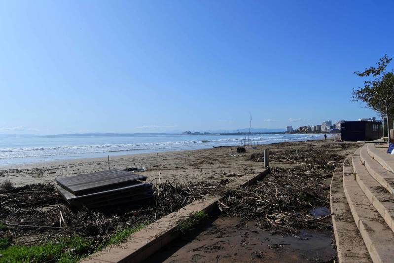De aanleiding voor een verblijf op deze camping in Roses is een bezoek aan het Dali House Museum in Portlligat, niet ver hier vandaan. Volgens de folder worden maar een beperkt aantal bezoekers tegelijk toegelaten en is reserveren noodzakelijk. Vanmorgen dus maar bellen, maar toen werd duidelijk dat de eerstvolgende bezoekgelegenheid pas aanstaande zondag is. Daarna heb ik de plaatselijke rondvaartboot firma gebeld, want wij willen immers nog tochtje langs de kust maken. Helaas, de rondvaartboten hier in Roses gaan dit seizoen niet meer de zee op. Tijd om een nieuw schema voor de komende dagen te maken. En daaruit komt naar voren dat we vandaag een wandeling langs de kust gaan maken. Het weer is, na het noodweer van gisteren, weer opperbest, al merk je dat het ’s nachts wat kouder is dan voorheen. De boulevard van Roses ziet er vandaag heel anders uit dan een paar dagen terug. Ditmaal geen donkere lucht maar stralend helder. De prachtige boulevard is veranderd in een breed zandpad. Op het stand aangespoelde spullen en resten van planten.