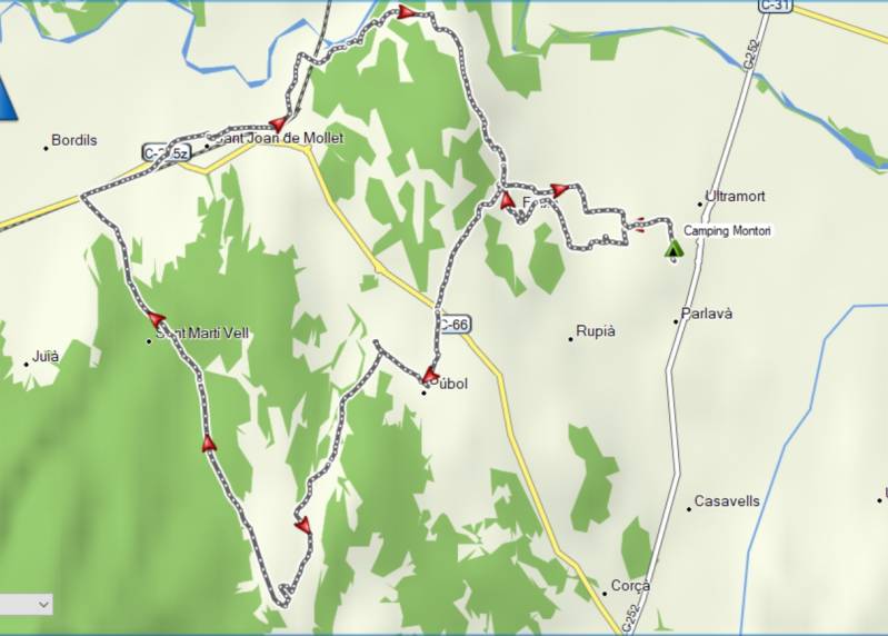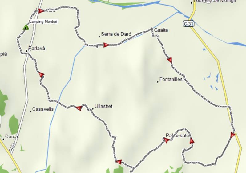 Hiernaast een afbeelding en de GPX file van de fietstocht van vandaag. De rit start en eindigt op Camping Rural Montori nabij Parlavá en is iets minder dan vijf en dertig kilometer lang.