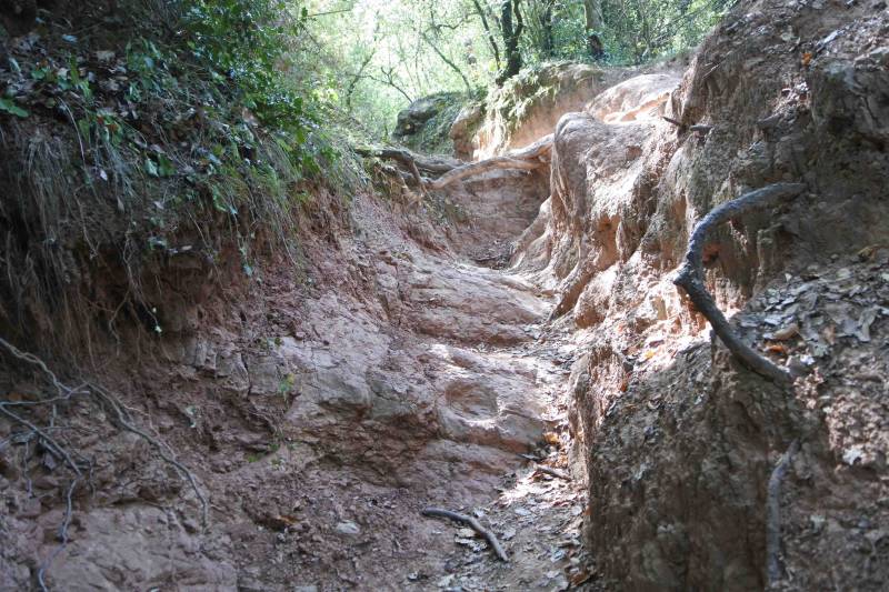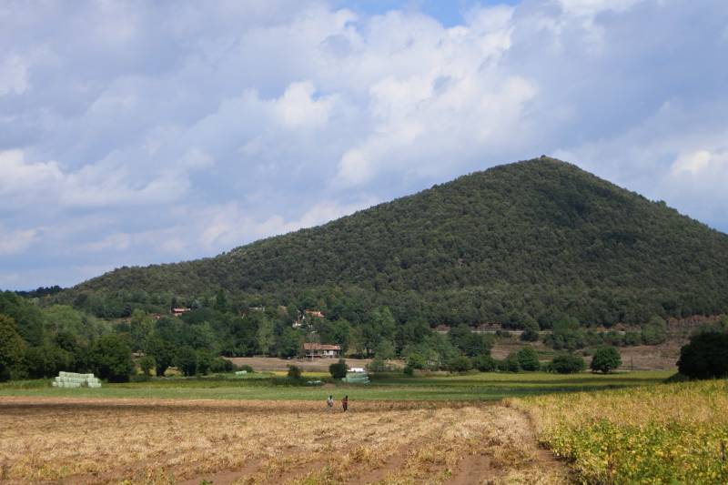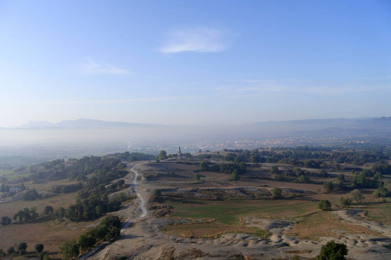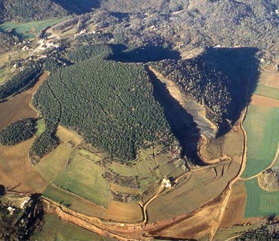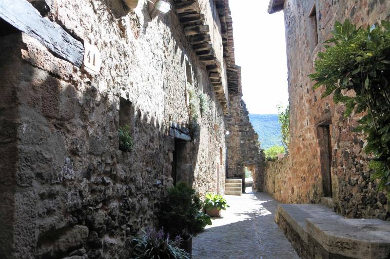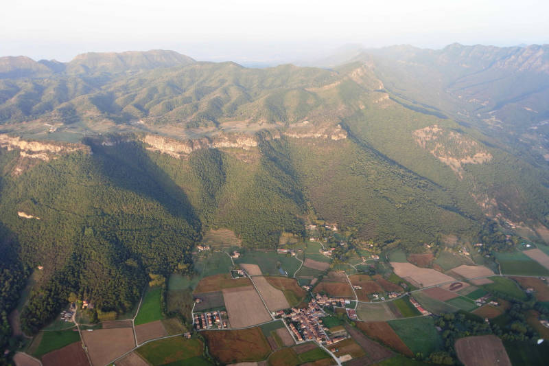 Net onder de Pyreneeën ligt in de provincie Gerona het natuurpark La Garrotxa, een gebied met tientallen gedoofde vulkanen. Een beetje te vergelijken met de Eiffel in Duitsland en uit dezelfde periode, zo’n 14000 duizend jaar geleden. Santa Pau, waar we nu zijn, ligt midden in de Garotxa en als we om ons heen kijken zien we in één blik meerdere van deze grote molshopen liggen.
