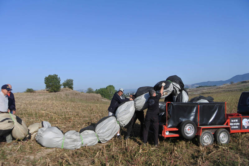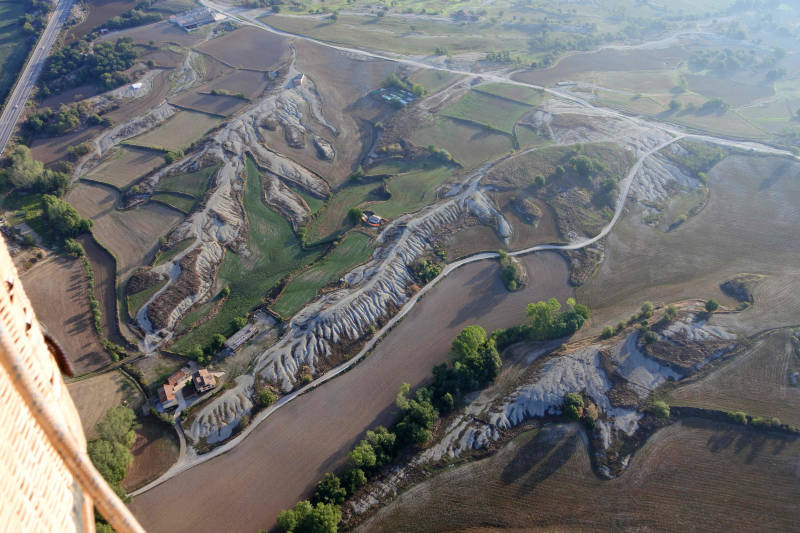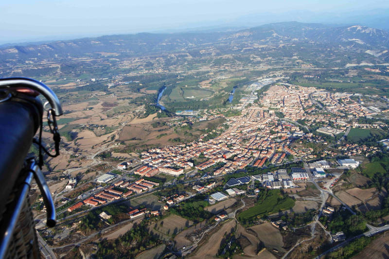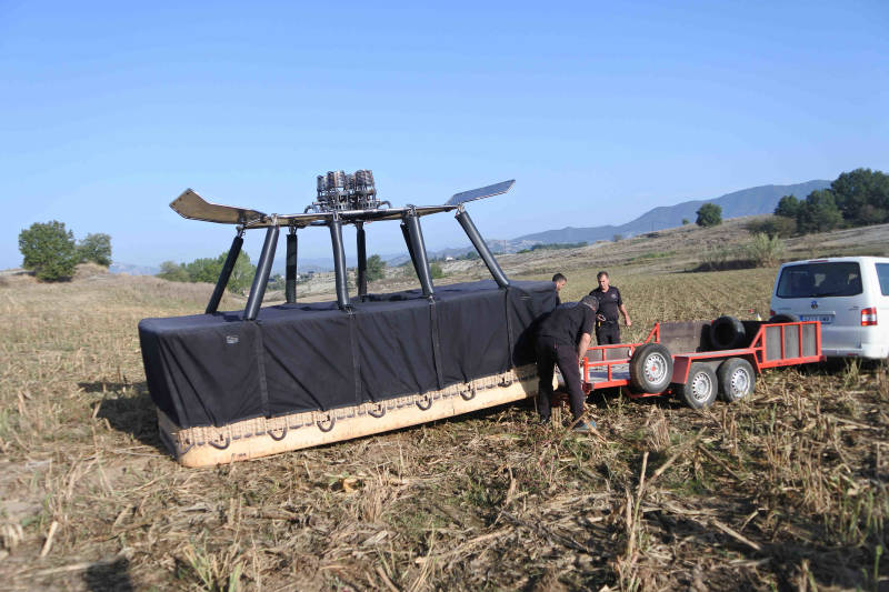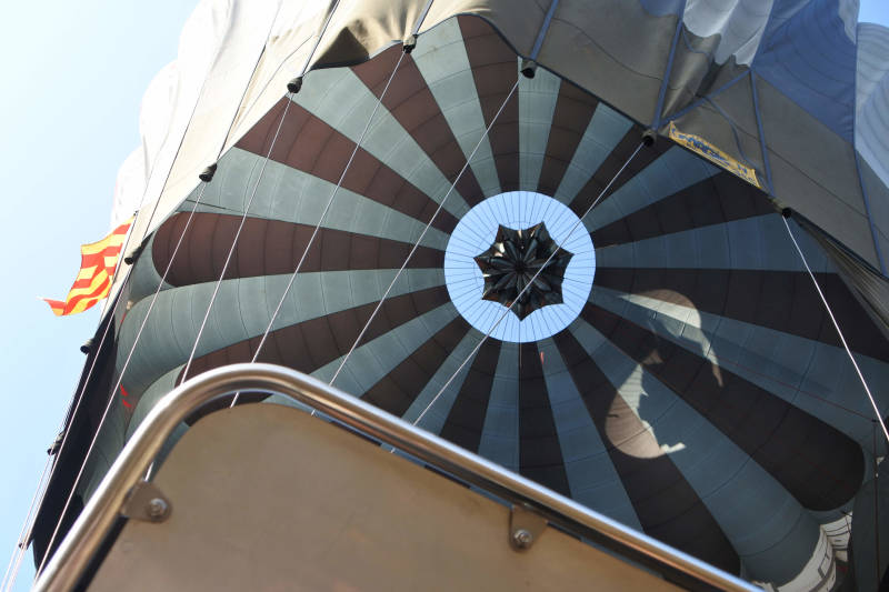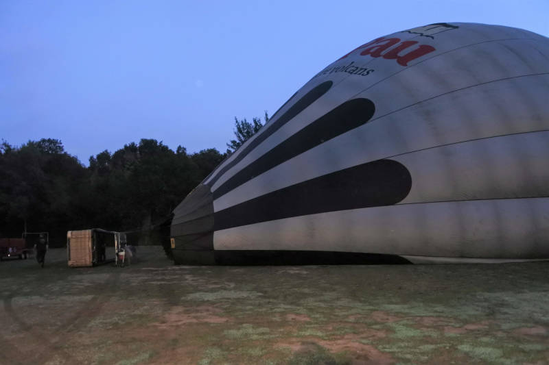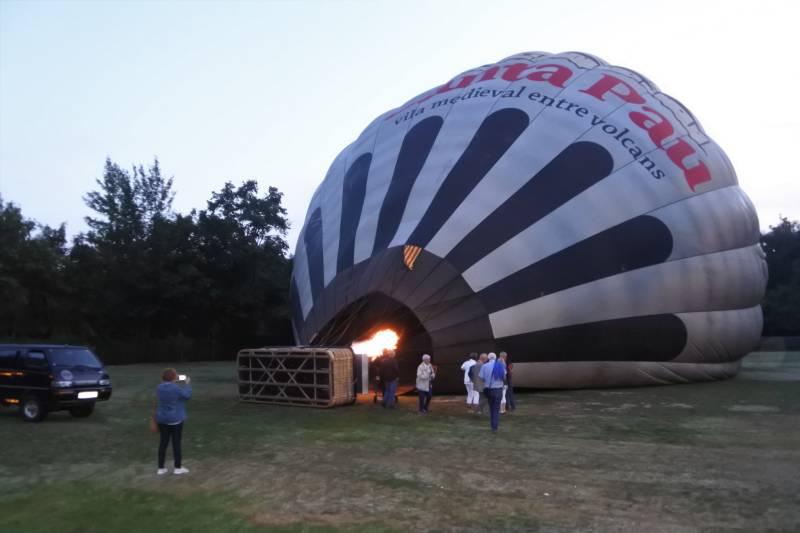 Voor het veilig vliegen met een heteluchtballon moet je stabiel weer hebben. Naar men zegt is de Garrotxa een erg geschikt gebied om te vliegen. Het bedrijf dat de vluchten aanbiedt geeft aan dat er vrijwel het hele jaar gevlogen kan worden, al is men juist als wij informeren nogal terughoudend om vooraf toezeggingen te doen. De ballon waar wij vandaag de lucht mee in zijn gegaan kan ongeveer zestien passagiers vervoeren. Nadat de ballon op de grond is uitgevouwen wordt er met een krachtige ventilator lucht in geblazen, waarna de ballon wat begint te bollen. Als de ballon zich voldoende heeft opgericht kunnen de branders die boven de mand zijn bevestigd worden aangestoken, zodat er hete lucht in de ballon wordt geblazen en deze recht boven de mand komt. In de ballon bevinden zich een viertal grote gascontainers, maar om die te sparen wordt er eerst een grote gascontainer die buiten de mand op de grond staat gebruikt. Het geheel van ballon, mand en passagiers weegt ruim twee ton. De mand wordt intussen met een lijn aan een vast punt (in ons geval een auto) vastgemaakt, om te voorkomen dat de ballon er onverwacht vandoor gaat.