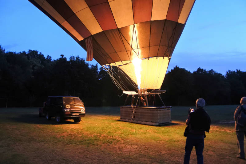 Eenmaal met passagiers aan boord en losgemaakt van de auto, gaat de ballon langzaam de lucht in. Eerst recht omhoog, totdat de wind de ballon pakt en we met de windrichting meedrijven. Wij gingen vandaag tot ruim duizend meter hoogte. Volgens de piloot wordt er, afhankelijk van toestemming van de luchtverkeersleiding, tot ongeveer 1500 meter hoogte gevlogen. Naar verluidt heeft men in een ballon geen last van hoogtevrees. Tijdens de vlucht is het een periodiek spel van langzaam zakken en weer even de branders aan, die met brullend geluid de lucht in de ballon verwarmen zodat deze weer omhoog gaat. Het is opvallend dat er niet in een rechte lijn wordt gevolgen. Op verschillende hoogten is de windrichting anders en kan het voorkomen dat je een heel andere richting uitgaat. Wij legden tijdens onze vlucht een traject af in de vorm van de letter J. Ook de snelheid is niet constant en varieerde tijdens onze vlucht tussen de drie en de dertig kilometers per uur. De mand draait vrijwel constant langzaam in de rondte zodat je steeds een wisselend uitzicht hebt. Met gebruik van de moderne navigatie en communicatie hulpmiddelen van tegenwoordig zorgt de ophaalploeg ervoor dat ze tijdig bij de landingsplaats staan. Wij landden vandaag in een stoppelig maïsveld, maar daar kan de ballon tegen. De ballon gaat ongeveer 600 vluchten mee. Zodra de mand de grond raakt wordt zo snel mogelijk een lijn vastgemaakt, maar de mand kan bij de landing wel stuiteren en/of kantelen. Door de piloot kan met een paar lijnen de bovenzijde van de ballon worden geopend, waardoor de warme lucht er na de landing snel uit kan. Ook aan de zijkanten van de ballon kunnen ventilatiegaten worden geopend. Met drie mensen en wat hulp van de passagiers kunnen ballon en mand binnen een kwartier weer zijn ingepakt.