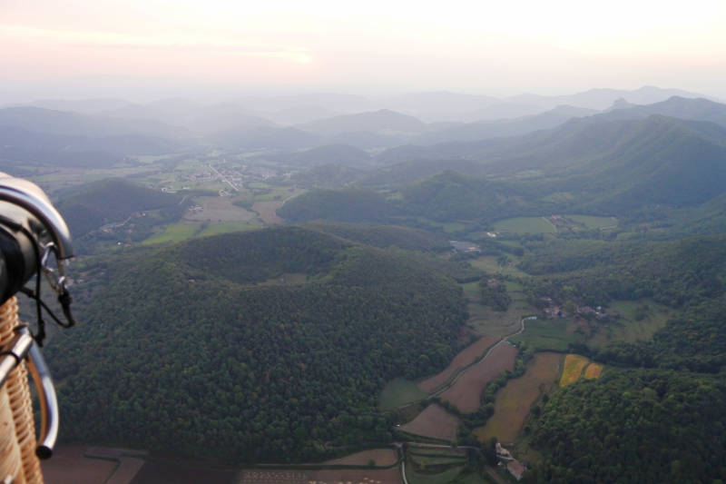 Toen we vorige week zondag een rondwandeling vanaf camping Lava nabij Santa Pau maakten, kwam ons plots een auto met aanhangwagen tegemoet, waarop de mand met branders van een heteluchtballon zichtbaar was. Het was nabij de thuisbasis van een bedrijf dat voor liefhebbers ballonvluchten verzorgt. Dat bracht Aukje op het idee om een oude wens van haar in vervulling te laten gaan: een vlucht met een ballon. En mooier dan vanuit de lucht kun je de vulkanen van de Garrotxa niet bekijken. Nu nog even zorgen dat het ook gaat gebeuren en dat blijkt nog geen sinecure. Natuurlijk ben je afhankelijk van het weer en er moet ook plek zijn in de ballonmand, maar het lastigste is nog het boekingsproces. Maar uiteindelijk lukt het om voor vandaag af te spreken en dat komt ons goed uit, want we zijn dan juist op weg naar de volgende etappeplaats van onze vakantie. Wel vroeg uit de veren, want er wordt vanwege de onstabiliteit in de lucht, alleen ’s morgens vroeg gevlogen. Met de wekker op vijf uur lukt het in het donker om ruim op tijd de locatie in het bos bij de Volcan Croscat te vinden. Vanaf zeven uur gaat men aan de slag en begint men de ballon op te blazen. Wij krijgen intussen een bakkie koffie en om half acht gaan we de lucht in. Het is nog schemer en even later zien we de zon voorzichtig boven de horizon komen. Naarmate die hoger komt wordt de lucht helderder en wordt het zicht steeds beter. Met een vaartje van ongeveer twintig kilometer per uur trekken we op duizend meter hoogte over het vulkaanlandschap en dienen verderop de bergkammen zich aan. Werkelijk spectaculair en tegelijkertijd ook heerlijk rustig. Halverwege de vlucht worden de flessen cava ontkurkt en wordt er getoast op dit hoogtepunt van de ochtend. De eerste keer in ons leven dat we 's morgens om acht uur al aan de drank zijn. Na ongeveer anderhalf uur wordt de landing ingezet. We komen uiterst zacht op de grond waar de ophaalploeg zich al heeft gereedgemaakt. De ballon legen, opvouwen en samen met de mand in twee aanhangwagens terug op weg naar de thuisbasis. Daar volgt nog een ontbijt in Catalaanse stijl, waarna we afscheid nemen en op weg gaan naar onze bestemming van vandaag: de camping nabij Banyoles.