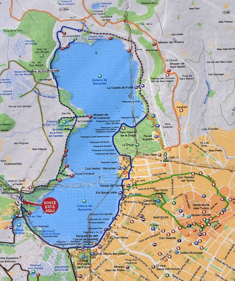 Het stadje Banyoles ligt aan een niet al te groot natuurlijk gevormd meer. En rond het meer is een mooi wandelpad van ongeveer zeven kilometer lengte. Voor ons een mooie gelegenheid om ter afwisseling eens voor een gemakkelijke wandeldag te kiezen, want zo’n meer ligt natuurlijk aardig waterpas. Het valt ons direct op dat alles rond het meer keurig netjes is aangelegd en opgeruimd, wat doet vermoeden dat het hier in het hoogseizoen wemelt van de toeristen. We wippen even aan bij het VVV waar een dame ons enthousiast uitleg geeft omtrent het hoe en waarom van het meer. Zo wordt het meer niet alleen gevoed door regen en kleine stroompjes, maar komt het water vanuit de omliggende bergen ondergronds omhoog. De diepte varieert van zestig tot honderd dertig meter en het kraakheldere water wemelt van de vissen. Het water kan worden afgevoerd via een systeem van omdijkte stukjes land zodat er bij een overvloed aan water tientallen vijvers ontstaan. Nu we toch in de buurt zijn maken we ook een rondgang door de binnenstad van Banyoles. Een paar leuke huizen en kerken en natuurlijk de pleinen met terrasjes vormen het hoogtepunt, want Banyoles ademt niet echt een sfeer van een ver verleden. Toch is het stadje oud, want al in tiende eeuw was er een systeem van bovengrondse watergangen of op z’n Spaans acequia’s dat ook nu nog in werking is. Verder resteert er nog een oude stadsmuur.