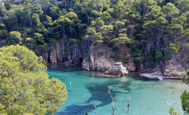 Begur en ook de camping waar we nu verblijven, liggen op ongeveer anderhalve kilometer van de kust. Vandaag kunnen we onze eerste kustwandeling van deze vakantie maken en de grillige Costa Brava leent zich daar goed voor. Vanaf de camping klimmen we eerst een stukje, waarna we een prachtig uitzicht krijgen op zowel de kust als de zee. Getuige de vele villa’s die tegen de heuvels zijn gebouwd is goed te zien dat hier niet het armste deel van de bevolking is neergestreken. Na nog een pittige klim over een rotspartij dalen we af en volgen daarna het GR-kustpad. We komen uit bij een druk bezocht strand. Het is weekend en met dit prachtige weer trekken ook de Spanjaarden massaal naar de kust. Het kustpad verder volgend moeten we steeds pittig omhoog en weer omlaag om een volgend strandje te bereiken. Met deze temperatuur een uitputtende bezigheid. Als we eindelijk de kust achter ons laten en richting het stadje Begur gaan moet er pas echt flink worden geklommen. Er lijkt voorlopig geen einde aan de klim te komen en mijn conditie is nog niet van dien aard dat ik steile hellingen gemakkelijk aankan. Na de lunchpauze kiezen we daarom voor een shortcut richting de camping en komen na vier uurtjes wandelen weer terug bij onze thuisbasis.
