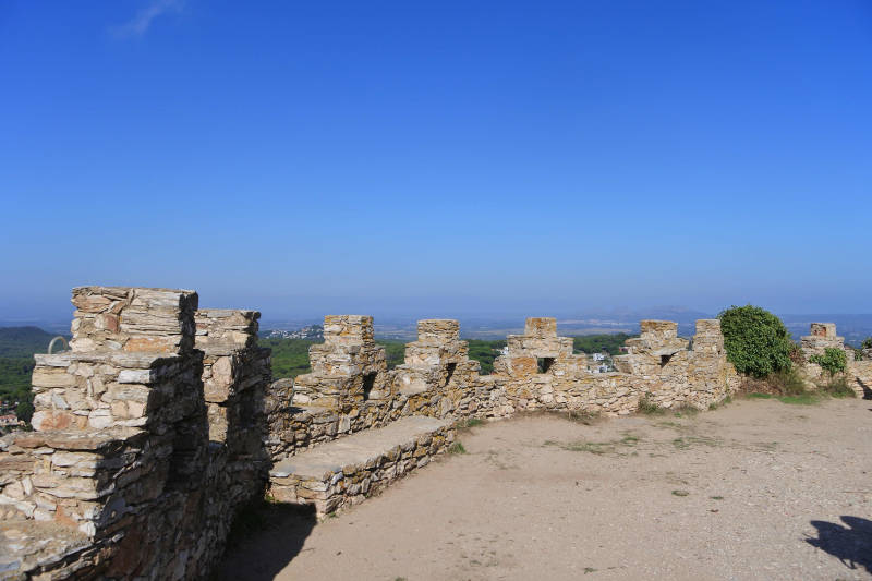 Letterlijk een verademing, deze camping. Jammer dat we vandaag al weer moeten vertrekken vanwege de seizoensluiting. Rust en frisse lucht zijn toch ingrediënten die het leven veraangenamen, zo hebben we de afgelopen dagen gemerkt. Ons plan is om naar een camping te verhuizen die voorlopig nog wel open blijft en dat wordt de camping nabij het plaatsje Pals ongeveer acht kilometer verderop. Op weg er naar toe maken we een stop in het centrum van Begur om het kasteel te bekijken en nog een rondwandeling te maken. Het kasteel heeft een parkeerplaats en door daar te parkeren dachten we een leuk plaatsje voor zowel het kasteelbezoek als de daarop volgende rondwandeling te hebben gevonden. Dat pakte helaas anders uit. De toegang tot de parkeerplaats gaat steil omhoog en door smalle straatjes waarbij borden aangeven dat in dit gebied alleen door bewoners mag worden gereden. Het verbod negerend wordt bij de parkeerplaats aangekomen duidelijk dat deze niet op campers is berekend. Voor straf moeten we flink manoeuvreren en langs een supersteile helling omlaag om weer op de normale weg te komen. Verderop vinden we wel een geschikte plek en vandaar gaan we te voet de heuvel op naar het kasteel. Het kasteel stamt uit de elfde eeuw en biedt een prachtig uitzicht over de omgeving. Tijdens de Napoleontische oorlog in 1810 is het verwoest en nu rest alleen nog een ruïne.