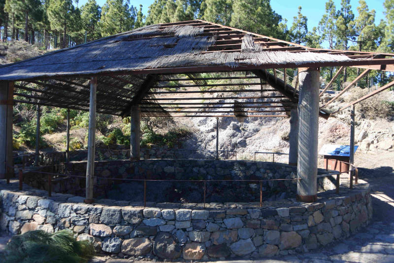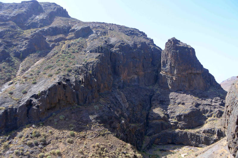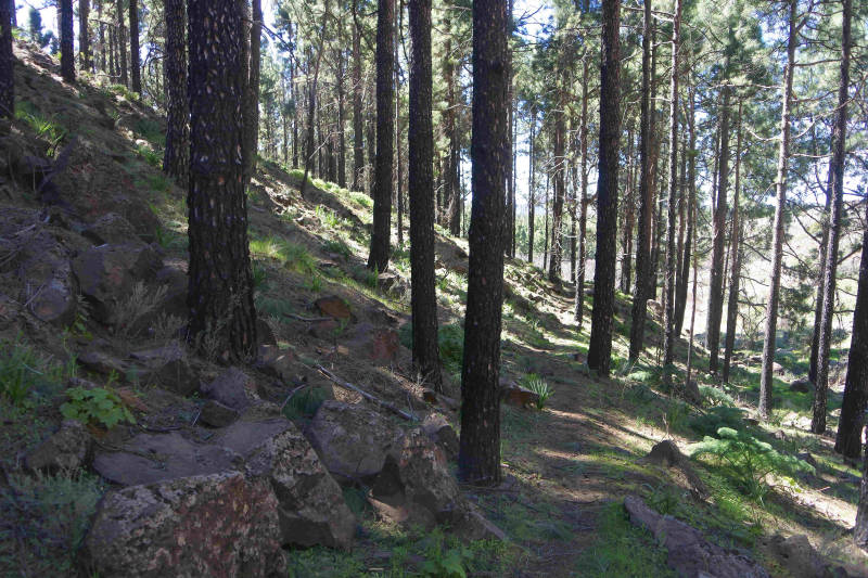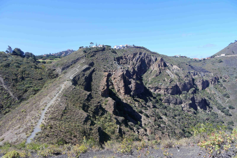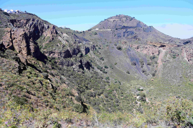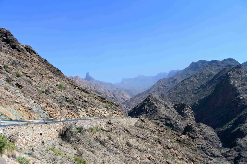 Tot nu hebben we steeds een specifieke plaats of omgeving bezocht. Om ook een indruk te krijgen van een minder toeristisch deel van het eiland maken we vandaag een rondrit. We rijden eerst langs de westkust naar het plaatsje Aldea de San Nicolas, kortweg Aldea genoemd. Tot El Risco gaat de route over dezelfde kronkelige weg die we voor het bezoek aan Charco Azul algelopen week hebben gereden. Daar begint een nieuw aangelegde weg met tunnels tot vlakbij Aldea. Deze weg, de GC2, wil men in de toekomst verder doortrekken, zodat je een stuk sneller langs de kust het eiland rond kunt rijden. Zodra we Aldea zijn gepasseerd gaat de route verder het binnenland in en wordt het een smal bergweggetje met steile hellingen en scherpe bochten waar auto’s elkaar lang niet overal kunnen passeren. Op zondag extra lastig omdat er vrij veel verkeer op de weg is. Wel een mooie route, want we rijden door een omgeving met kale maar kleurrijke rotspartijen. Uiteindelijk bereiken we het Tamadaba natuurgebied, waar we een rondrit maken.