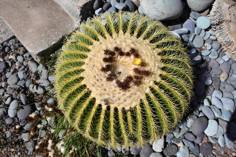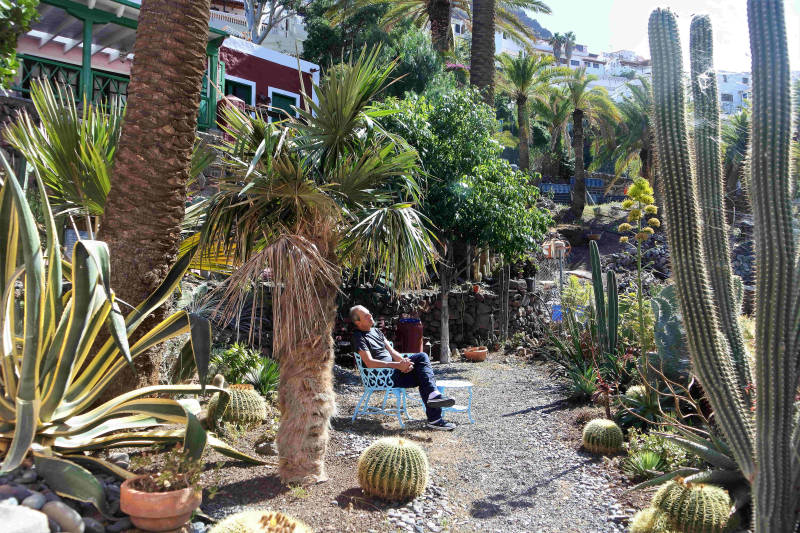 Vanmorgen eerst even rustig aan met wat huishoudelijke beslommeringen. Zo komt casita eigenaar Sancho op visite die we gelijk naar het hoe en waarom van onze douche vragen. Hij is het met ons eens dat deze onder de maat is, maar komt op de proppen met een verhaal over een mevrouw van Finse komaf die van de hoed en de rand zou weten. Het zou iets te maken hebben met een pomp en leidingen die zouden kunnen springen. Niettemin gaat hij proberen er voor de resterende periode iets er aan te laten doen. We zijn benieuwd. In de tussentijd behelpen we ons met een vooraf gevulde bak met warm water die we ‘á la Johannes de Doper’ over ons heen gieten. In de middag rijden we naar Agaete waar in de Hortus Botanicus vroeger kunstenaars met elkaar debatteerden. Niet spectaculair, maar voor 1,50 euro toch een leuk uitje. Daarna rijden we door naar de supermarkt voor nog wat aanvullende inkopen. We ontdekken vlakbij de Mercadona en Lidl nog een grote Hiperdino en ook nog een Chinese Bazar. Kortom, met meer spullen dan gepland vangen we de thuisreis naar onze casita aan. Het weer is de afgelopen dagen wisselend, maar verder prima geweest. De eerste twee dagen rond de twintig graden maar wel met aardig wat wind. Gisteren prima wandelweer en vandaag is het zonnig met zo’n 24 graden. Tegen de avond trekt de lucht dicht en steekt er een zwoele wind op. Dat is de Sirocco die vanuit de Sahara woestijnzand aanvoert, de z.g. La Calima, die voor dit weekend is beloofd.