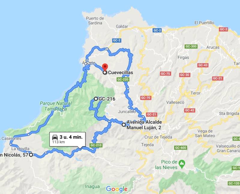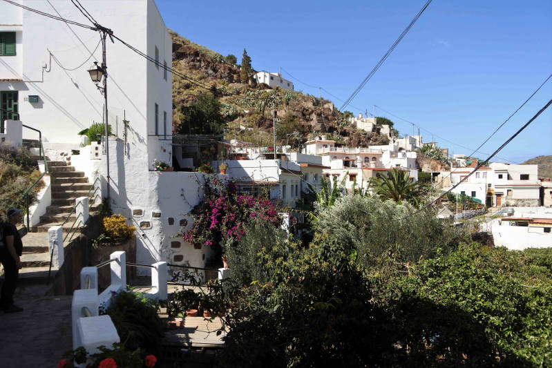 Hier heeft vorig jaar een enorme bosbrand gewoed, waardoor het merendeel van de boomstammen zwart geblakerd is. Vervolgens rijden we door naar Artenara, op 1200 meter hoogte het hoogst gelegen dorp van Gran Canaria. Hier zoeken we eerst een restaurantje op om te eten, waarna we een rondwandeling door het dorp maken. Tenslotte stappen we weer in de auto voor het laatste stuk naar huis. Volgens Google een reisdag van in totaal 113 kilometer met een netto rijtijd van meer dan drie uur.