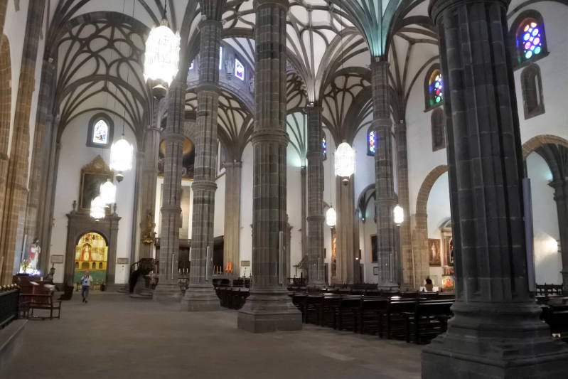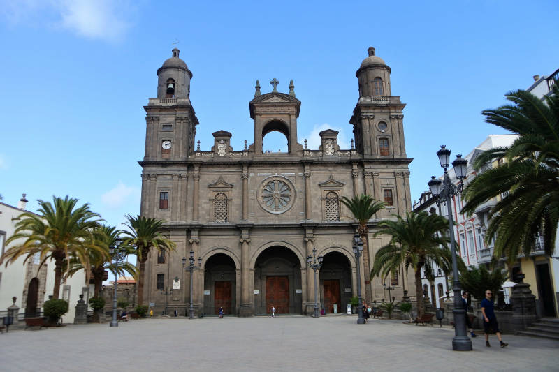 Na het museumbezoek lopen we naar de nabijgelegen kathedraal, gewijd aan Santa Ana. Een kolossaal gebouw en het grootste van de Canarische Eilanden. Met de bouw ervan werd in 1500 al gestart, maar wegens tussentijds geldgebrek duurde het zo’n 300 jaar voordat deze uiteindelijk gereed was. Met als gevolg dat er verschillende bouwstijlen zijn toegepast. Van binnen is de kerk wat sober en niet erg mooi, zeker als wij die als verwende toeristen met die van elders in Europa vergelijken.