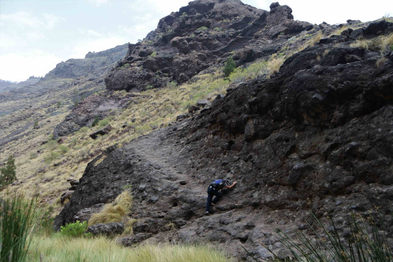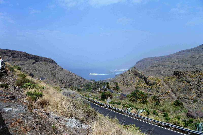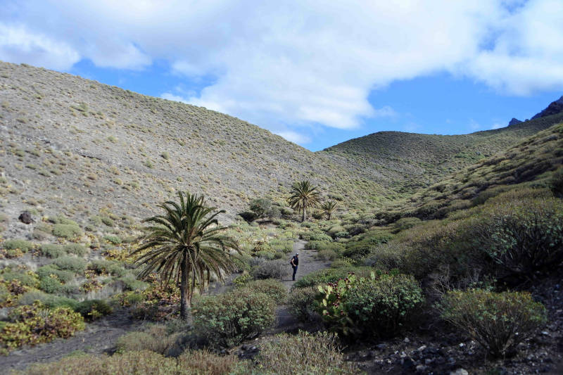 Vanmorgen blijkt de lucht nog niet kraak helder en dus niet zo geschikt voor het bezoeken van een plek met mooie vergezichten. Bovendien komt de Finse mevrouw nog langs, dus kunnen we niet vroeg weg. Daarom kiezen we voor een wandeling naar de Charco de Azul, een waterval aan het eind van een kloof die begint bij het gehucht El Risco, aan de westkant van het eiland. Wat de Finse mevrouw betreft kunnen we kort zijn. Binnen twee minuten nadat ze was gearriveerd bleek dat ze niets voor ons kon betekenen. Maar geen nood, eigenaar Sancho had inmiddels een van zijn andere kennissen bereid gevonden om aan de slag te gaan. Maar ja, die had vandaag en misschien ook morgen nog geen tijd. Dus het doucheverhaal krijgt wellicht nog een vervolg. De rit naar El Risco gaat over een enorm kronkelige weg langs de kust. Daar aangekomen gaan we te voet verder, eerst door het gehucht zelf en daarna de Baranco de Juan Chorro in.