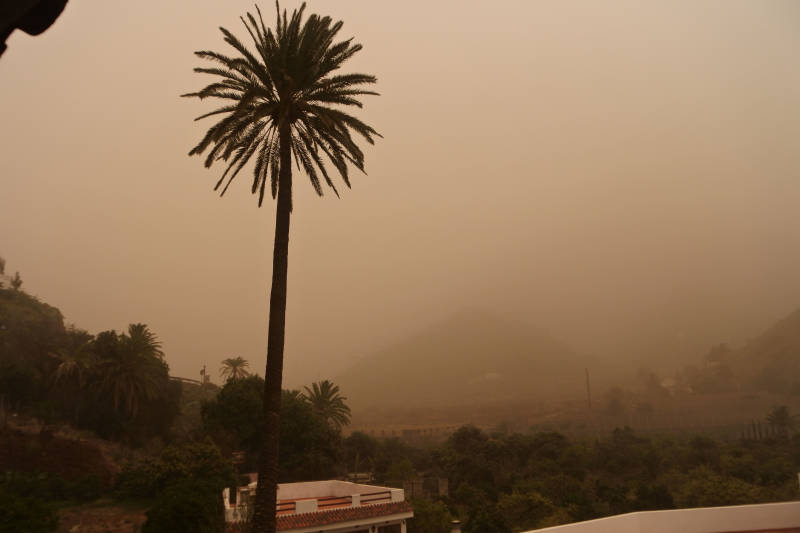 Gisteravond en vooral vannacht bezorgde de Calima ons wat overlast. Eerst een vlagerige wind en daarna werd de lucht licht oranje van het Sahara zand. Of dit alles nog niet genoeg was brak er gisteravond op zo’n 25 km bij ons vandaan een bosbrand uit, waardoor enkele dorpen uit voorzorg moesten worden ontruimd. Zwoel buiten, maar door het stof in de lucht was binnenblijven het devies. Maar ook binnenshuis liep het anders dan gewenst. Net toen de eieren de koekenpan in moesten viel de stroom in de keuken uit en even later zaten zowel de buren als wij helemaal zonder stroom. Geen ramp natuurlijk, maar het moest niet te lang duren want in een ontdooide koelkast hebben we ook geen trek. Natuurlijk onze huisbaas geapped en señor Sancho liet weten dat hij de tuinman langs zou sturen om een en ander na te kijken. Wij wachten, maar geen tuinman natuurlijk. Intussen was de stroomvoorziening al weer gedeeltelijk hersteld, maar niet nog in de keuken. Dat betekent: niet koken en geen warm water voor de afwas en de douche. Bij navraag liet Sancho weten dat de tuinman voor onze deur had gestaan, maar dat hij ons niet wilde storen… nou zeg! Op aanwijzing van Sancho kon ik zelf de groepenkast vinden en de schakelaar resetten, probleem opgelost…. zo dachten wij. Tegen etenstijd bleek de keuken alweer zonder stroom en nu zou Sancho weer iemand proberen op te trommelen om de zaak te onderzoeken. En warempel, er kwam een alleen Spaans sprekende man die na onderzoek uitkwam op een stopcontact in de keuken. In de lasdoos erachter bleek het een rommeltje met losse en verbrande draden en kortsluiting tot gevolg. Zo goed en zo kwaad het ging knoopte hij de boel weer aan elkaar en vanaf dat moment doet alles het weer. Behalve de douche natuurlijk, maar daar komt morgen een Finse vrouw naar kijken… is ons beloofd.