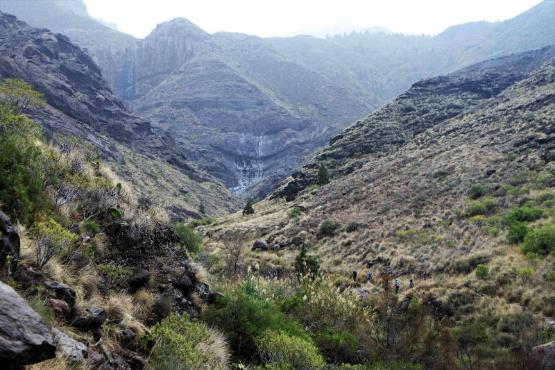 Na zo’n twintig minuten klimmen door een weelderige natuur bereiken we de waterval, die vanwege de droogte op het eiland momenteel niet meer water geeft dan onze douche. Net als we denken niet verder te kunnen, zien we een steil pad dat omhoog voert. Wel pittig klimmen en klauteren geblazen, maar als beloning komen we bij de ‘bron’ van de waterval waarvandaan we na een pauze weer terug wandelen naar El Risco. In het plaatselijke restaurantje eten en drinken we nog wat voordat we de kronkelige thuisreis aanvaarden.