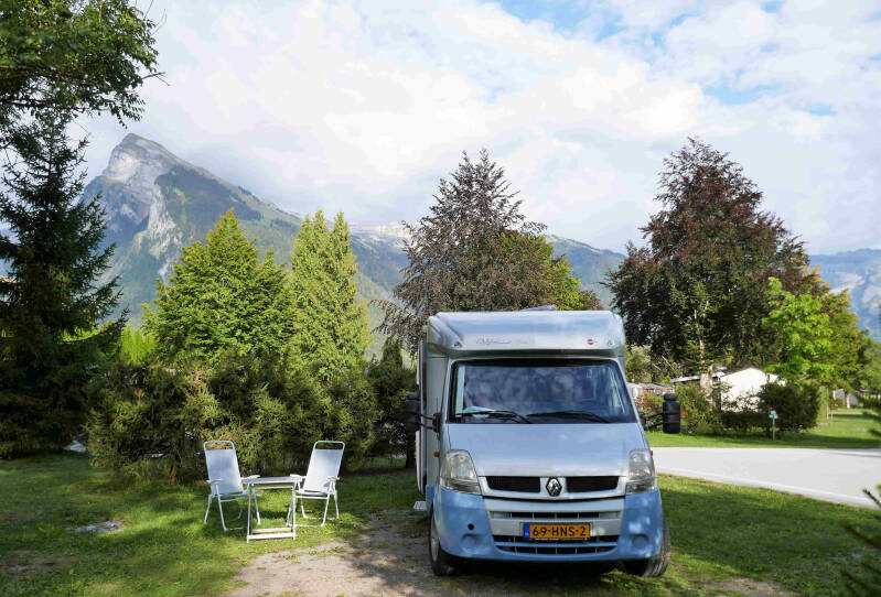 Vanmorgen is het, evenals de afgelopen dagen, weer prachtig weer. Dus rustig aan en vóór vertrek nog even een rondje rond de nabijgelegen kerk om toch nog een indruk van het dorpje te krijgen. Gisteren hebben we 180 kilometer afgelegd en voor vandaag staan er 230 op het programma. Niet langs tolwegen en dat betekent dat de TomTom hier ongeveer vier uur voor nodig denkt te hebben. Rond twaalf uur verlaten we de camping en met slechts één tussenstop onderweg is het toch al weer rond vijf uur als we ons bij camping Le Giffre in het plaatsje Samoëns melden. Evenals gisteren wel een prachtige en afwisselende route en vaak door de bergen. Camping Le Giffre, genoemd naar het riviertje dat er langs stroomt, is ruim opgezet en het hele jaar open. ’s Winters vooral vol met wintersporters, maar nu in het tussenseizoen is er voldoende plaats. Wij kiezen een royale plek met veel privacy en kunnen het hier naar schatting wel een tijdje uithouden.