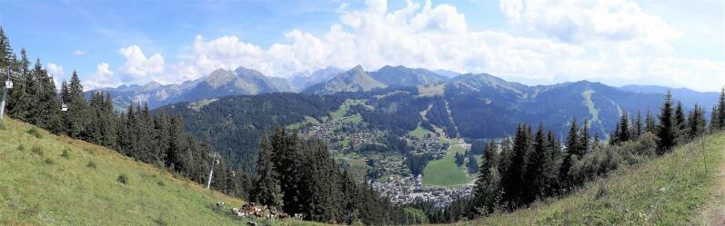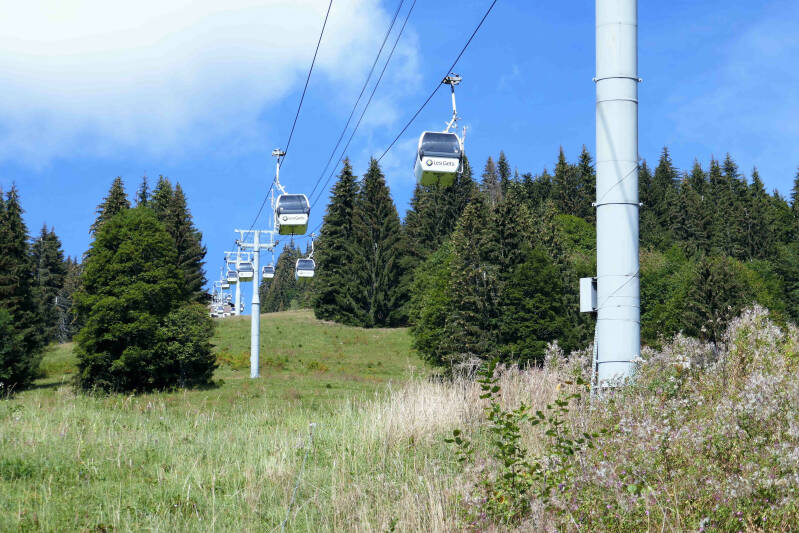 Wij willen vandaag een bergwandeling maken. En, luxe berggeiten als wij zijn, roepen we daarvoor de hulp van een skilift in. Met de lift een stuk naar boven en dan de rest met de benenwagen. Volgens de info van het VVV is het dorp Les Gets de enige plaats in de omgeving waar de skilift na het hoogseizoen nog in bedrijf is. Volgens internet is daar dit weekend tevens een mountainbike event. Wel een half uurtje rijden met de camper en ook weer terug natuurlijk. Omdat we zaterdag veel drukte verwachten, starten we voor ons doen op tijd. Via een mooie kronkelige bergweg bereiken we om half elf de parkeerplaats naast de lift waar, buiten verwachting, nog volop plaats beschikbaar is. Al snel wordt duidelijk waarom. De lift is buiten gebruik. Waarschijnlijk is het mountainbike event vanwege corona afgelast en heeft het VVV deze info niet doorgekregen of is het alweer vergeten. Niet uit het veld geslagen passen we ons programma aan. Te voet naar boven tot waar de lift ons zou brengen en dan het laatste stuk naar de top van de Mont Chéry maar overslaan. Wat volgt is een bijzonder leuke wandeling met heerlijk wandelweer. Bij het eindstation van de lift aangekomen, het Belvédère, hebben we een prachtig uitzicht over het dal en op de talloze bergen in de omgeving. Net als de afgelopen dagen komt er in de loop van de middag bewolking opzetten waardoor de toppen in de verte aan het zicht worden onttrokken. Voor ons een teken dat het geen zin heeft om nog hoger te gaan, want ook vanaf de top van de Mont Chéry zal het zicht vanwege de bewolking niet veel anders zijn. Weer terug op de camping kijken we tevreden terug op een prachtige wandeldag.