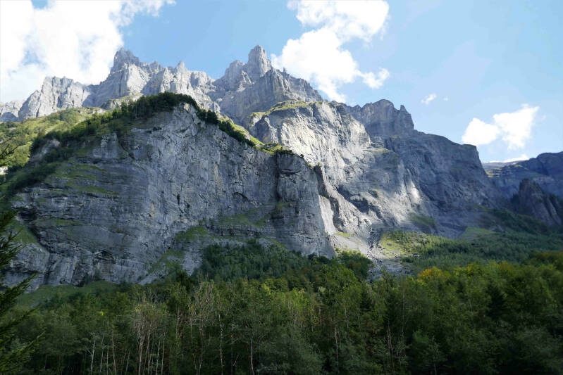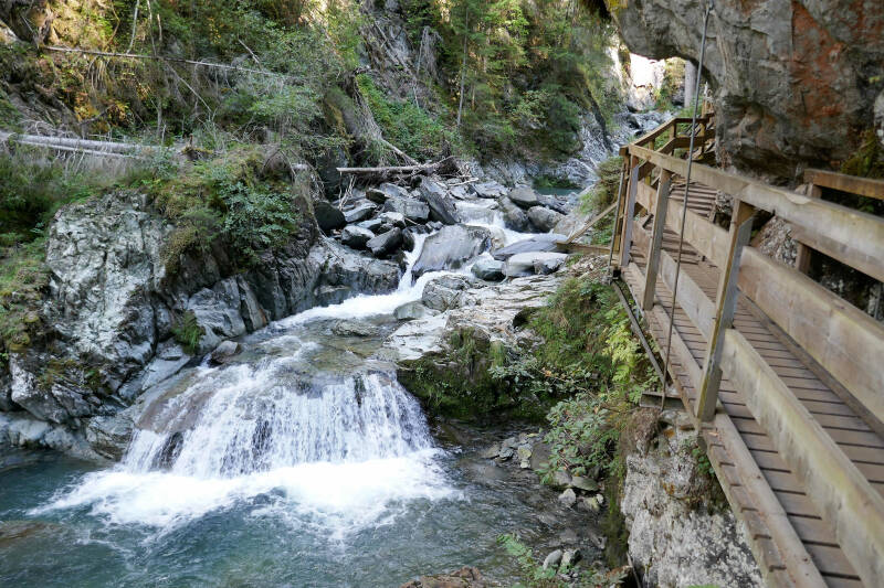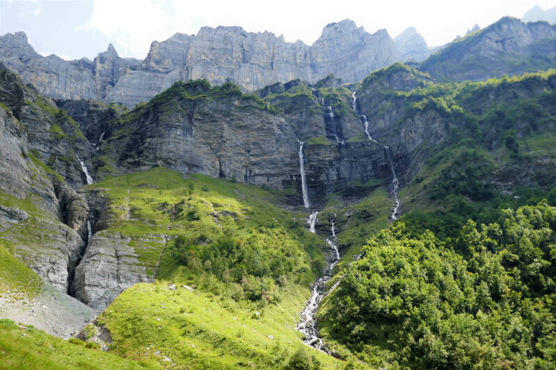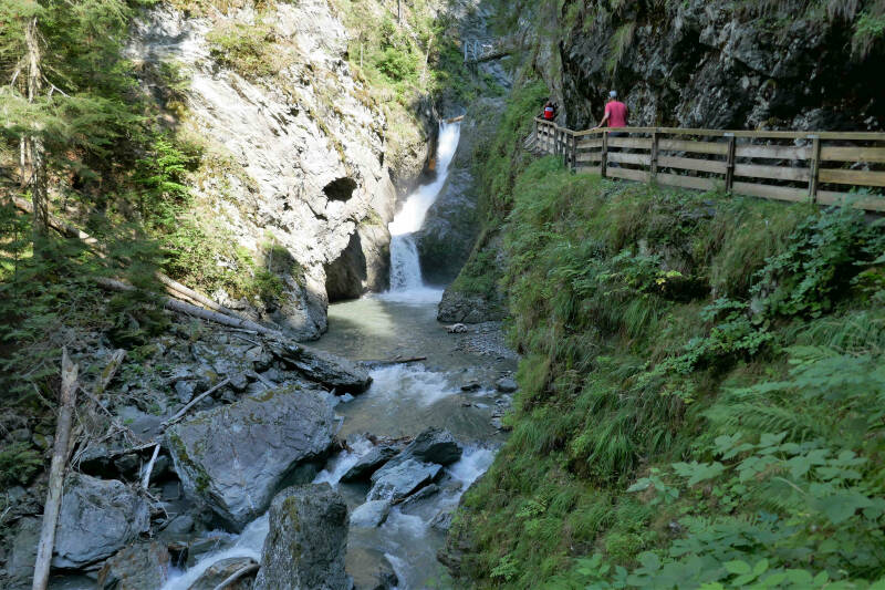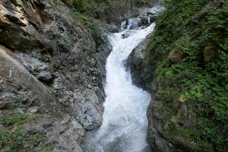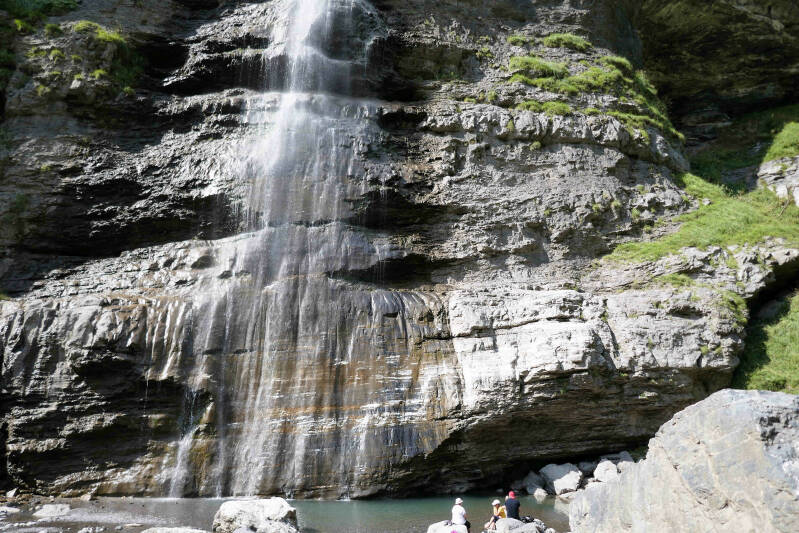 Vandaag dus de watervalwandeling, aan het einde van het dal. Na een ritje van 12 kilometer komt het startpunt in zicht, maar voordat we kunnen parkeren worden we nog even langs het loket gestuurd. Tien euro aftikken en als ik even verder de camper parkeer zie ik dat men al heel wat eurotjes gevangen heeft. Blij dat we gisteren niet zijn gegaan, want dan moet het helemaal druk zijn geweest. De naam van de wandeling is Le Cirque de Sixt Fer à Cheval, een rondwandeling door een dal met de vorm van een hoefijzer. Al snel na het begin gaat het brede pad omhoog en even verderop komen we in een groep wandelaars terecht waarbij het een gekakel van jewelste is. Het lijkt wel of men elkaar in jaren niet heeft gezien. Gelukkig geeft de GPS een alternatieve route en als we ze later weer zien, zorgen we er voor dat we een beetje uit de buurt blijven. De natuur is prachtig en om ons heen steken bijna loodrechte wanden wel een kilometer de lucht in. Het duurt niet lang, of de eerste watervallen zijn te zien. Vooraf hadden we er rekening mee gehouden dat de hoeveelheid water karig zou zijn, maar dat valt erg mee. Natuurlijk zal het er in het voorjaar wel ruiger aan toe gaan. Achter in het dal gaat het pad steil omhoog totdat het tegen de rotswand doodloopt. Dat punt wordt Le Bout de Monde genoemd. Op de terugweg gaat de route langs de andere kant van de rivier en worden we opnieuw verrast door de mooie natuur. Voldaan keren we terug naar de camper en daarna naar de camping in Samoëns.