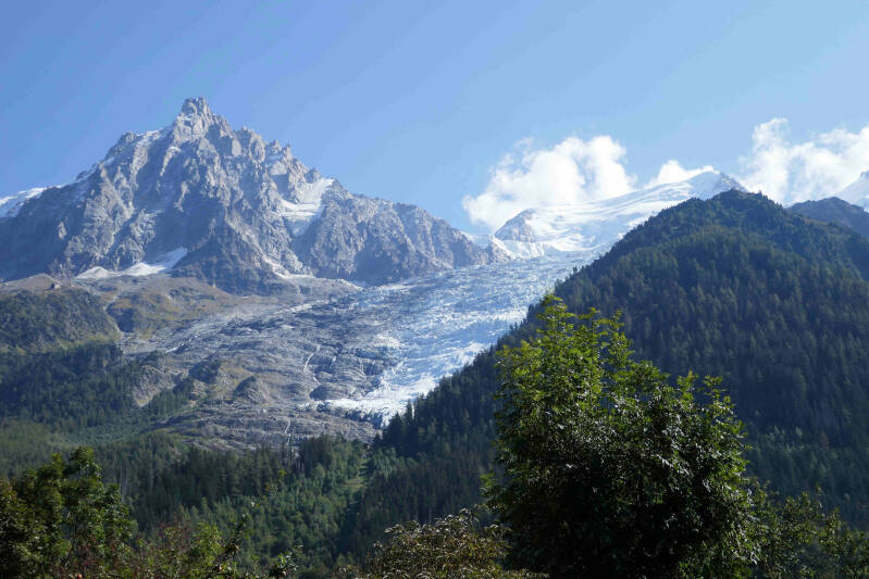Vanaf onze camping: links de Aiguille de Midi en rechts de Mont Blanc met op de voorgrond de Bossons gletsjer