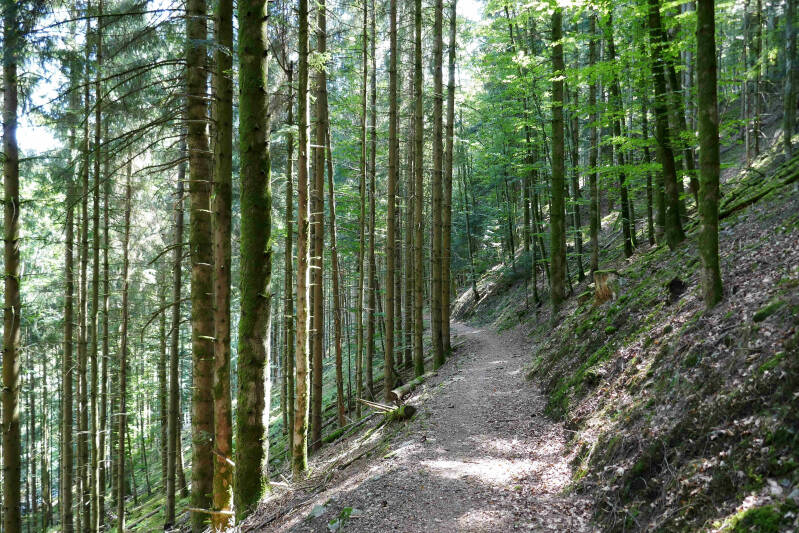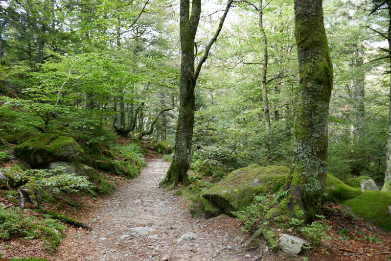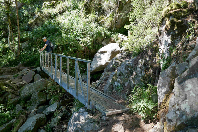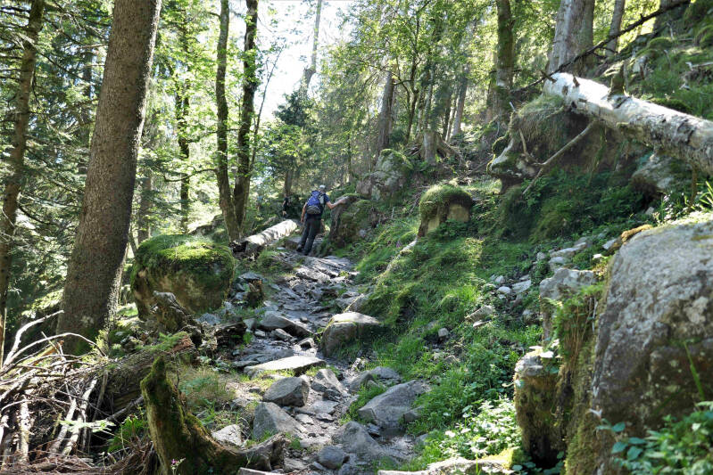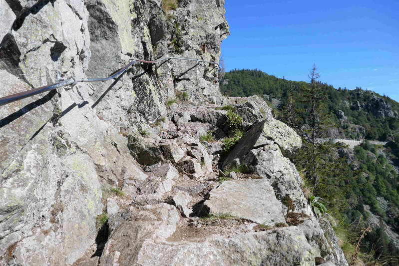 Vandaag trekken we er op uit voor een pittige rondwandeling. Het vertrekpunt is de Col de la Schlucht, waarna de route ons via het Sentier de Roches het Frankenthal in voert. Vandaar gaat het weer omhoog tot aan de hoogste top van de het departement Vogezen, de Honneck. Daarna over de kam van de bergketen weer terug naar het startpunt. Op papier geen gemakkelijke tocht, waarvoor wordt gewaarschuwd dat deze niet in de winter moet worden gemaakt. Het Sentier de Roches doet zijn naam eer aan, want vrijwel direct na de start wordt het klauteren in plaats van wandelen. Langs de rotswand is een soms moeilijk begaanbaar pad uitgehouwen, dat op en neer golft en met de uitstulpingen van de rotsen meedraait. Er lijkt geen eind aan te komen, maar na een kleine drie kilometer klauteren bereiken we toch de splitsing met een pad dat het Frankenthal invoert. Gemakkelijk omlaag zodat we weer op adem komen, maar na de lunchpauze in het dal moeten we weer omhoog. Goed begaanbaar en niet moeilijk, maar wel veel energie vretend. Uiteindelijk bereiken we de Honneck waar je een prachtig uitzicht op de Elzas en de Vogezen hebt. Vanaf de Honneck gaat het alsmaar omlaag zodat we ons gemiddelde wat kunnen opschroeven en even na vijf uur weer terugkomen bij de camper. Een prachtige maar pittige tocht van meer dan zeven uur zit er op. En vandaag stralend weer, de eerste dag met echt mooi weer van deze vakantie.