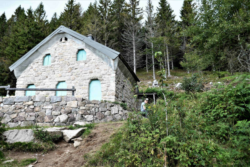 Vandaag is het dan zover, het weer doet zijn best om ons uit de camper te lokken, dus geen excuus meer om op de camping te blijven. Op weg naar Gazon de Faing, het startpunt van de rondwandeling, wordt onze voorraad boodschappen aangevuld bij de Super U van Anould. Daarna richting Col de Bonhomme, onze overnachtingsplek ingeval het afgelopen zondag mooi weer zou zijn geweest. Na even rondkijken op de col rijden we langs de Route des Crêtes naar het startpunt van de wandeling. Om half twee alweer lopen we eerst omhoog naar een krater-vormige rand vanwaar een prachtig overzicht hebben op ons wandelgebied van vandaag, met diep in de laagte het Lac des Truites ou du Forlet. Het weer is inmiddels duidelijk minder geworden, bewolkt en fris, wat afbreuk doet aan de foto’s van onze huis, tuin en camper fotografe. Het eerste stuk gaat langs de kraterrand, maar daarna is er een steile afdaling.