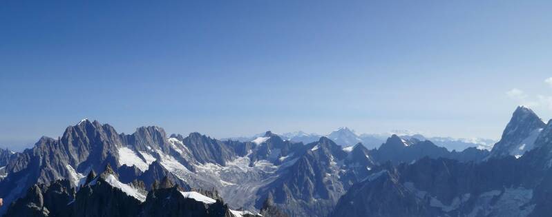 Vandaag gaan we opnieuw naar Chamonix, maar nu met de bedoeling om de Mont Blanc van dichterbij te bekijken. Dat kan vanaf de top van de Aiguille du Midi, weliswaar een kleine kilometer lager dan de Mont Blanc, maar met de kabelbaan bereikbaar. We pakken ditmaal wel de bus er naar toe en tegen half elf melden we ons bij het loket van de kabelbaan. Normaal betaal je hiervoor 65 euro per persoon, maar door de Multipass en als senioren krijgen we flink wat korting. De cabine van de kabelbaan brengt ons eerst naar 2300 meter en na overstappen bereiken we de top op ruim 3800 meter. Eerst maar eens op het terras rondkijken en dat valt niet tegen. Het is vandaag prachtig zonnig weer en we kijken onze ogen uit. Naar de Mont Blanc natuurlijk, maar ook naar talloze andere bergen met een witte muts. We zien ook parapenters die samen met ons met de kabelbaan omhoog zijn gekomen en nu over de sneeuw afdalen om vanaf een sneeuwplatform hun vlucht aan te vangen. Behalve de uitzichtpunten heeft men nog een paar andere attracties toegevoegd zodat we snel een paar uur hebben doorgebracht en het geheel zeer de moeite waard blijkt.