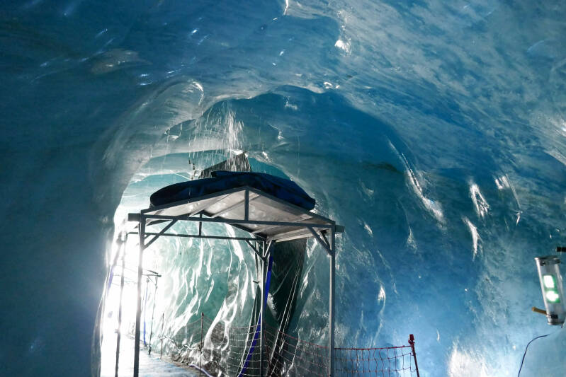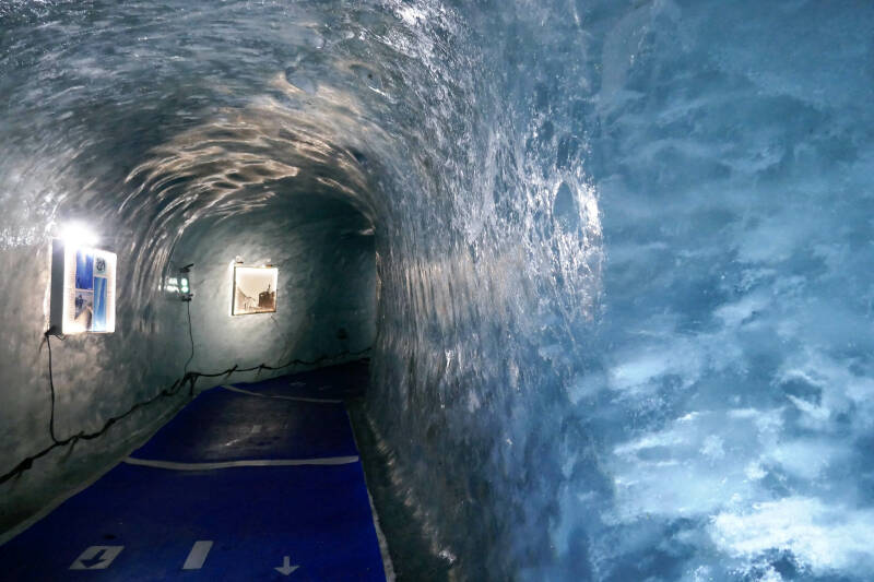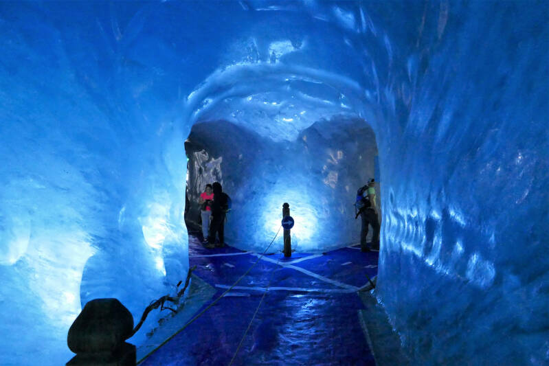 Weer beneden gaan we op weg naar de ons volgende uitje van vandaag: De Montevers Mer de Glace. Hierbij gaan we met een oude tandradtrein naar een hoogte van 1900 meter. Daar aangekomen stappen we in de cabine van een kabelbaan die ons weer stuk omlaag brengt, het dal van de Montevers gletsjer in. Maar dan zijn we er nog niet. Ons wacht nog een afdaling van, volgens opgave, 550 traptreden voordat we bij het ijs van de gletsjer aankomen. Hier heeft men in het ijs van de gletsjer een tunnel gemaakt waardoor je een rondgang kan maken. Bij de ingang van de tunnel loopt het smeltwater met straaltjes omlaag, maar verderop is het zó koud dat de wanden geen water afgeven. Een prachtige belevenis, lopend door een ijstunnel met aan de wanden allerlei panelen met wetenswaardigheden en foto’s van hoe het vroeger was. De tunnel moet elk jaar opnieuw worden gemaakt. Niet alleen doordat hij in de winter onder een metersdikke sneeuwslaag wordt bedolven, maar ook doordat de gletsjer elk jaar verder smelt. Weer terug in Chamonix zoeken we opnieuw de bus weer op die ons in een kwartiertje afzet vlakbij de camping. Een prachtige dag om op terug te kijken.
