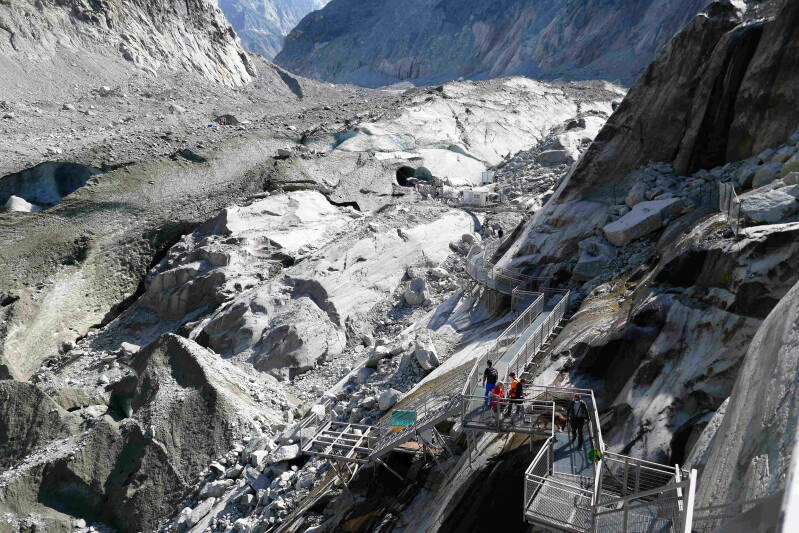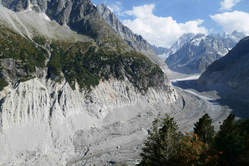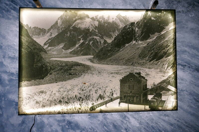 Rond de voorlaatste eeuwwisseling zocht men in Chamonix naar mogelijkheden om de toeristen iets bijzonders te bieden. Het idee ontstond om een hotel te bouwen naast de Montevers gletsjer die hoog boven Chamonix ligt en met 12 km de langste van Frankrijk is. Hiermee kon men het hele jaar door voor een winterervaring zorgen. Na drie jaar bouwen was een tandradspoorlijn over een lengte van ruim vijf kilometer aangelegd en kon een treintje met een stoomlocomotief ervoor het hoogteverschil van 900 meter overwinnen. De toeristen konden vanuit de trein zó in het hotel en ook direct de gletsjer op. Een hele bezienswaardigheid en vertier op ‘niveau’. Door het smelten van het ijs is de gletsjer steeds dieper komen te liggen en daardoor moeilijker bereikbaar. Dit heeft men aanvankelijk opgelost door een kabelbaan te bouwen die vanaf het treinstation zo’n honderd meter de diepte in gaat. Doordat het ijs de afgelopen decennia steeds verder is gesmolten moet men tegenwoordig vanaf het eindpunt nog een fikse afdaling via stalen trappen maken op tot op het ijs te komen. Aan de wand is met bordjes het niveau van de gletsjer over de afgelopen jaren aangeduid. Mede hierdoor wordt pas duidelijk hoe snel het afkalven van de gletsjer voortschrijdt en zal niemand die dit ziet (behalve Trump wellicht) ontkennen dat de aarde warmer wordt.