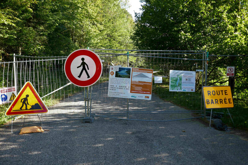 Voor vandaag staat een wandeling rond het stuwmeer van Kruth-Wildenstein op het programma. Niet zo’n gemakkelijke als een paar dagen geleden in Xonrupt Longemer. Deze rondwandeling gaat wat verder van de oever af en bevat een paar leuke klimmetjes, zo is de verwachting. We zijn nog maar net de camping af of er staat een bord dat aangeeft dat de weg naar het stuwmeer niet toegankelijk is vanwege werkzaamheden aan de stuwdam. De wand van de stuwdam wordt van een nieuwe asfalt laag voorzien en de dam is hermetisch afgesloten. Gelukkig kunnen voetgangers, met een omweg en met extra klim erin, om de afsluiting heen. Daarna verloopt de wandeling volgens plan en lopen we over een leuk pad dat steeds omhoog voert. Aan het einde van het stuwmeer volgt een vrij steile afdaling en na de lunchpauze vangen we de terugweg aan. Op nog maar een paar kilometer van de camping is er als bonus een klim naar de Schlossberg in de route opgenomen. Zoals de naam al aangeeft heeft op de top van de berg vroeger een kasteel gestaan, dat inmiddels in een ruïne is veranderd. Onze Wikiloc route volgend gaat het zigzaggend omhoog totdat we bij een punt uitkomen waarna we niet verder kunnen. Weer terug bij de aanvangsplek, volgen we een ander pad dat ons, na opnieuw een flinke klim, uiteindelijk bij de beloofde ruïne brengt.