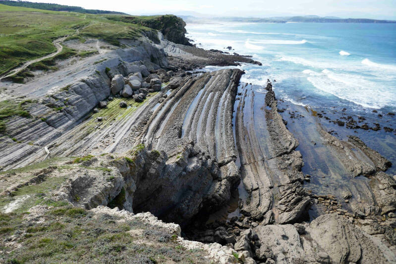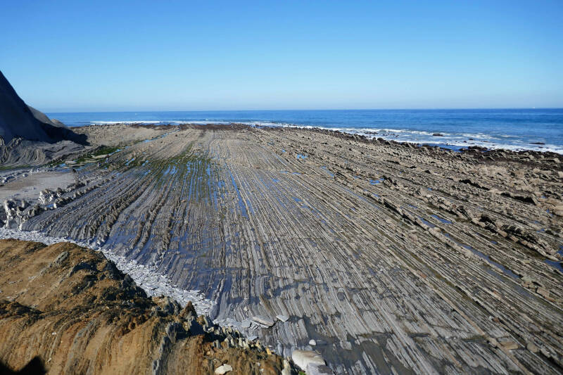 Eigenlijk zouden we vandaag een lange wandeling willen maken. Maar na ons bezoek aan San Sebastian gisteren is onze overtuiging dat dit niet goed zou uitpakken, dus besluiten we het vandaag rustig aan te doen. Afgelopen zaterdag tijdens ons bezoek aan het nabijgelegen Zumaia bleek het half bewolkt. Bovendien was het bijna hoogwater en om de flysh structuren goed te kunnen zien heb je eigenlijk eb nodig. Inmiddels is het tij zodanig verlopen dat het rond één uur laagwater is. Een tijdstip dat prima overeenkomt met het tijdschema van onze wekker. Hieronder nog wat foto's van de flysh.
