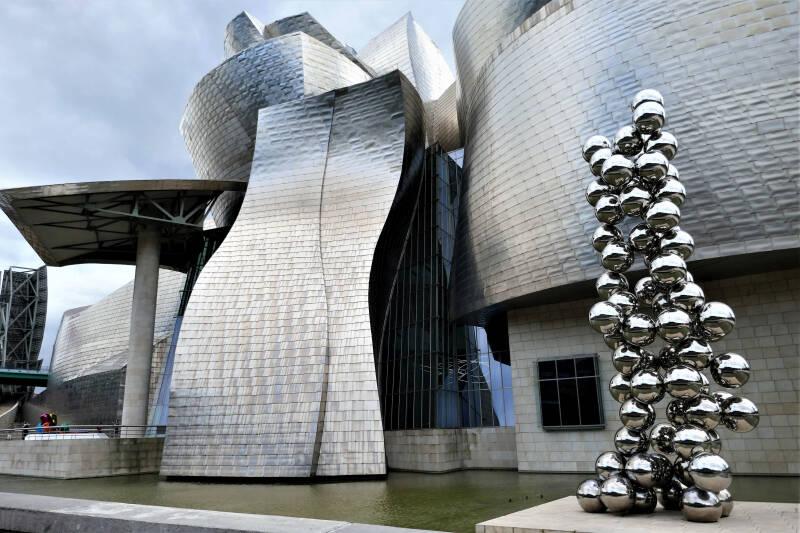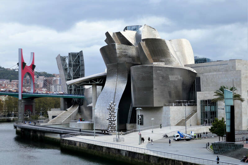 Vandaag gaat het toch gebeuren: Een bezoek aan Bilbao. Bilbao heeft geen campings, maar wel een grote camperplaats met flink wat voorzieningen. En deze ligt in de buitenwijk Alta Mira (Hoog uitzicht) en dat geeft ons vanuit de camper een mooi uitzicht over de stad. Met de camper erheen kost ons zo'n drie kwartier, waarbij het laatste stuk flink moet worden geklommen. Nadat we ons hebben geïnstalleerd is er nog voldoende tijd om de stad te bezoeken en met name het wereldberoemde Guggenheim museum staat voor vandaag op het programma. Buslijn 58 stopt vlakbij de camperplaats en gaat om de twintig minuten naar het oude centrum van de stad, de Casco Viego. Van daaruit is het nog zo'n twee kilometer te voet voordat het glinsterende bouwwerk in zicht komt. Het blijkt niet druk vandaag en voor slechts 6 p.p. staan we binnen. Het gebouw is heel bijzonder en vinden we zowel van buiten als van binnen ook heel mooi.