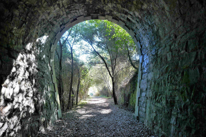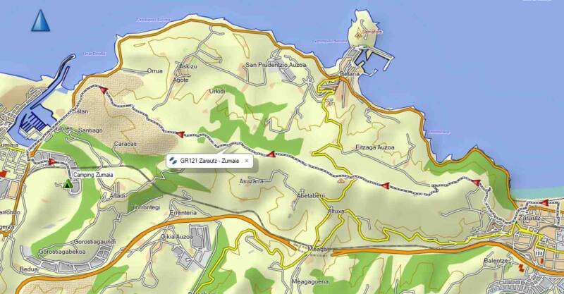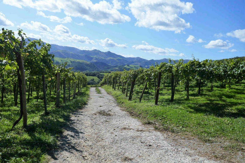 Na de regen van gisteren belooft het vandaag weer zonnig te worden, dus tijd om er weer op uit te trekken. Je hebt vanuit hier niet alleen volop wandelmogelijkheden, maar ook het openbaar vervoer is goed verzorgd. Daarom pakken we vandaag de trein naar het richting San Sebastian gelegen plaatsje Zarauts en wandelen vandaar terug naar de camping. Over een pad dat niet pal langs de kus gaat, maar de GR121 van het St. Jacobspad volgt. Een breed en prima beloopbaar pad dat tussen de wijngaarden door slingert. Zo te zien moeten de kleine trosjes nog verder groeien en rijpen voordat ze worden geoogst. De kleine witte druiven zijn op dit moment nog niet erg smaakvol, maar ja, we kwamen ook eigenlijk om te wandelen en niet om te snoepen.