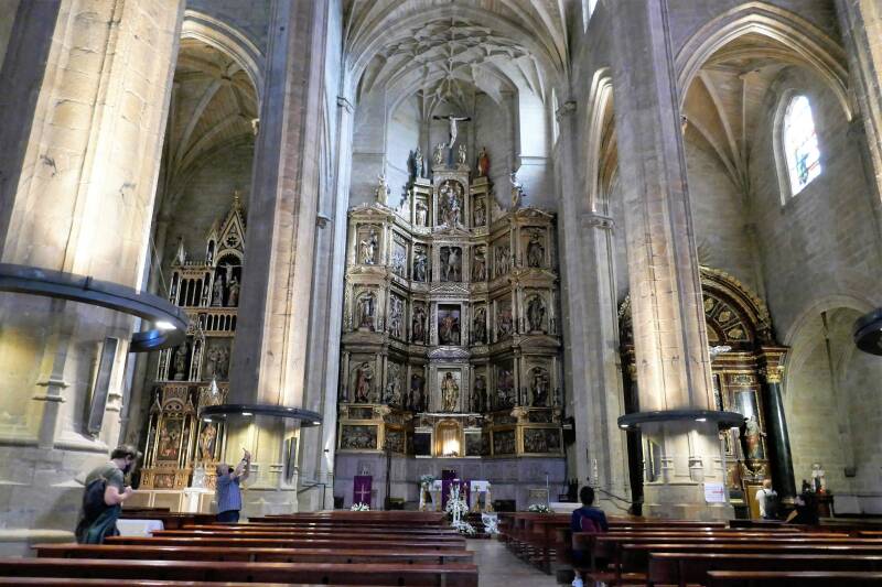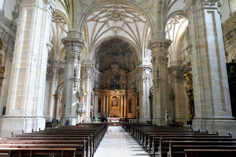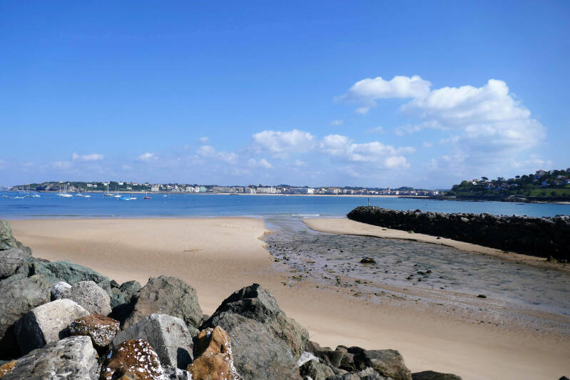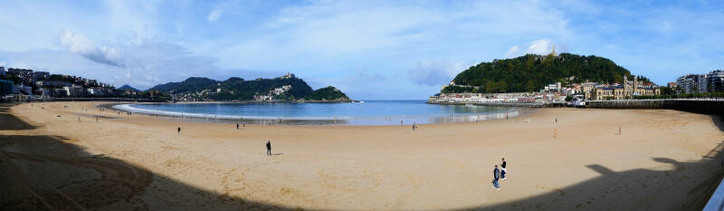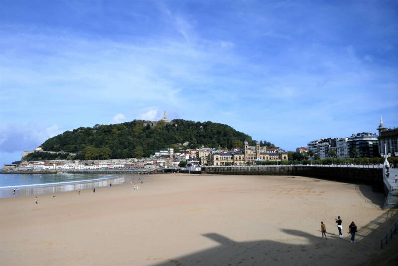 Bilbao is de hoofdstad en ook de grootste stad van Spaans Baskenland of Euskadi, zoals de Basken het zelf noemen. Maar San Sebastian (of Donostia volgens de Basken) moet veel mooier zijn. Wij gaan vandaag bekijken of dit inderdaad het geval is. San Sebastian ligt op ongeveer 35 kilometer vanaf Zumaia en er zijn campings die dichterbij de stad liggen. Maar vanuit Zumaia gaat elk half uur de Euskotren en een ritje van 40 minuten met deze boemeltrein lijkt ons ook wel wat. Voor de prijs hoef je het niet te laten, want die bedraagt maar 2 euro 75. Prominent aanwezig is de grote baai, Bahia de la Concha, waar de bezienswaardigheden zoals de oude stad, de heuvel Urgull, een mooie boulevard en niet te vergeten het Palacio Miramar aan liggen. We halen eerste een plattegrond en extra info op bij het toeristenbureau en bezoeken daarna een tweetal kerken voordat deze vanwege de siësta tussen de middag gaan sluiten. Daarna is het tijd voor de koffie en vervolgens beklimmen we heuvel Urgull met onder meer een Engelse begraafplaats. Boven op het oude kasteel een levensgroot beeld geplaatst, dat vanaf elke plek rondom de baai is te zien. De oude binnenstad ziet er zeer verzorgd uit met een keur aan klassieke gebouwen die de rijkdom uit het verleden weerspiegelen. We boffen dat het vandaag prachtig weer is zodat we de rest van de dag al wandelend door de oude stad en rond de baai doorbrengen voordat we aan het begin van de avond de trein weer opzoeken.